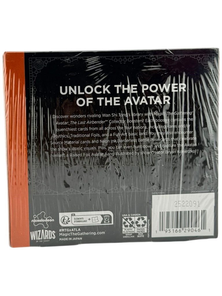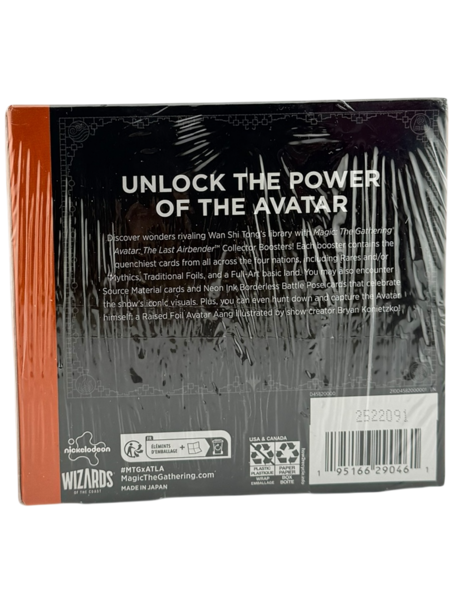 This Avatar: The Last Airbender – Collector Booster Box is brand new and factory sealed. The original shrink wrap and box seals are fully intact with no rips, tears, dents, or signs of tampering. All packs inside remain unopened and exactly as packaged by Wizards of the Coast. This is an authentic, sealed product, ideal for collectors and premium MTG buyers.