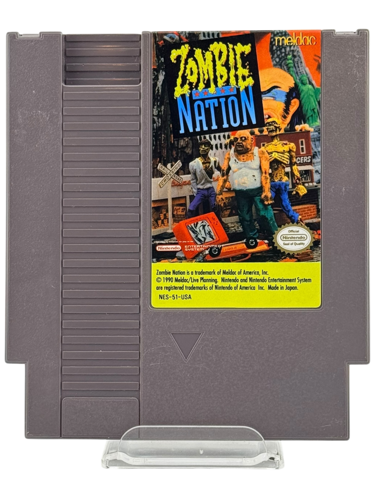 This Zombie Nation listing is for a loose NES cartridge only. The cartridge is authentic, has been tested, and is fully functional. The label shows light to moderate wear consistent with age, and the cartridge shell may exhibit minor scuffs from normal use. No original box or manual is included. Please review the photos carefully for exact cosmetic condition, as they are part of the description.