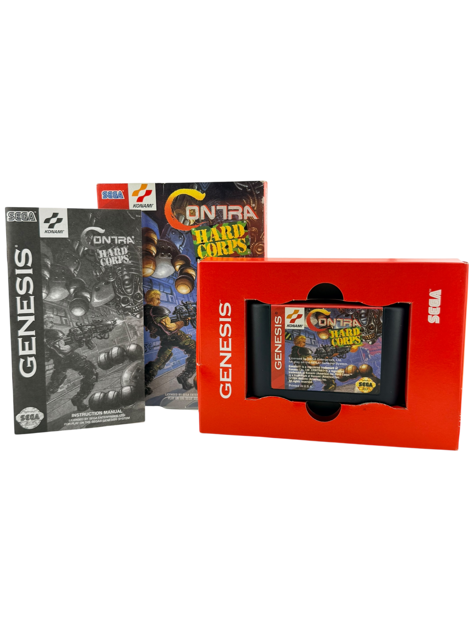 This copy of Contra: Hard Corps [Cardboard Box] for the Sega Genesis is complete in box (CIB). The listing includes the original game cartridge, original manual, and the original cardboard retail box with cover artwork.