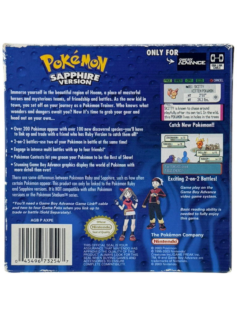 For collectors, Pokémon Sapphire is especially desirable in Complete in Box condition. Original GBA boxes and manuals were easily damaged or discarded, making true CIB copies increasingly hard to find — and Pokémon titles remain among the most sought-after collectibles in the entire Nintendo library.