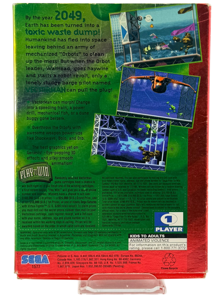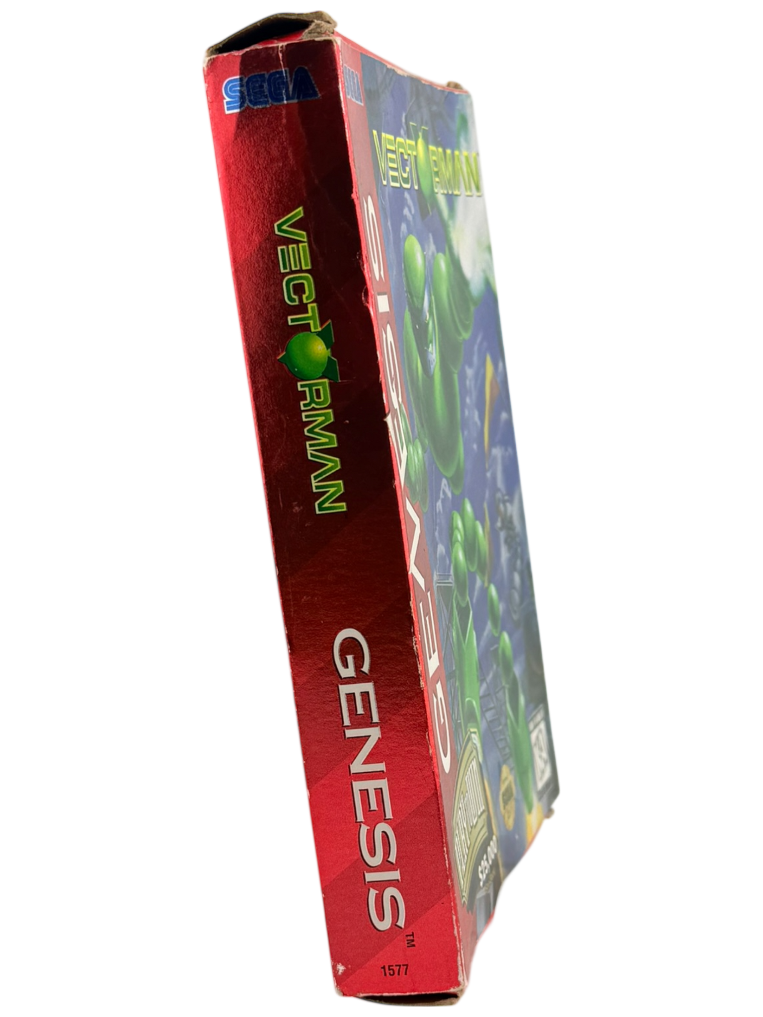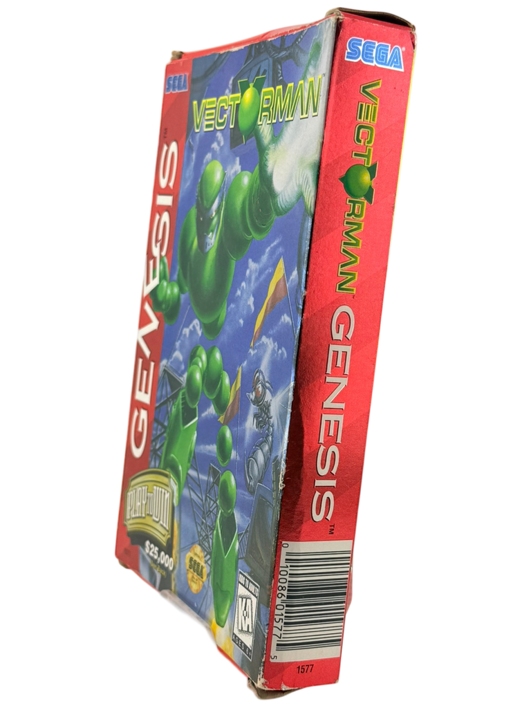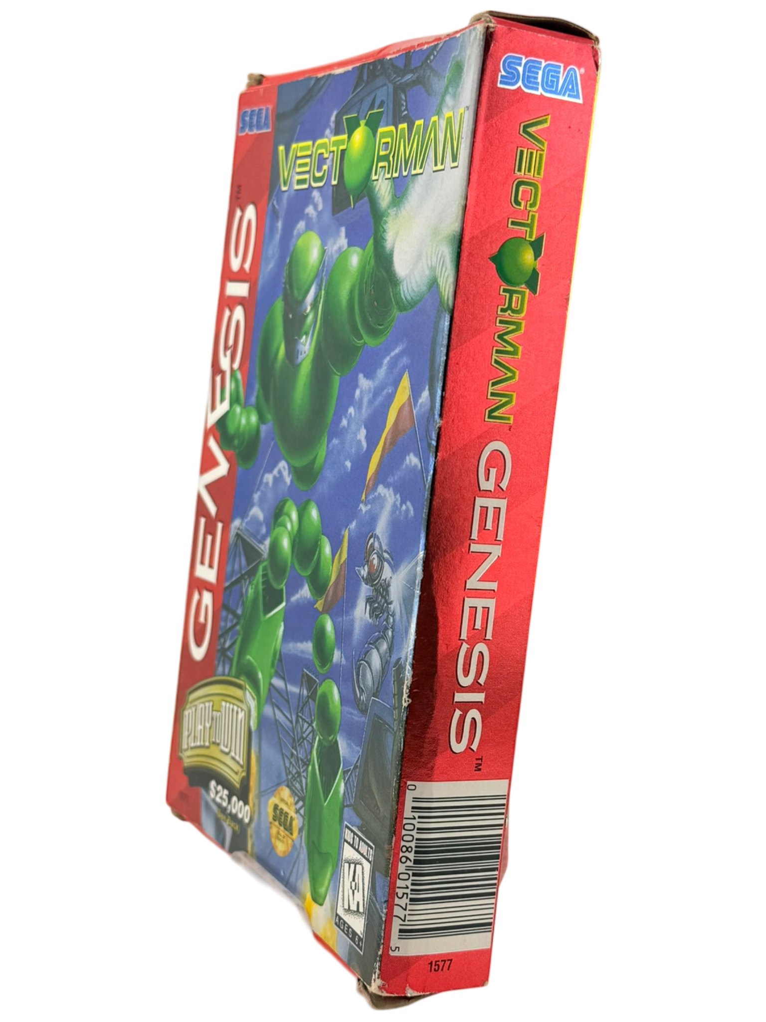 Game and box copy of Vectorman for Sega Genesis. Includes the original cartridge, original case/box, registration card, and additional inserts/extras. Original manual is not included. Cartridge has been tested and works properly. Box may show signs of wear such as edge wear, creasing, or surface marks consistent with age, and inserts may show light handling wear. Please review all photos carefully to assess the exact cosmetic condition of the item and included materials.