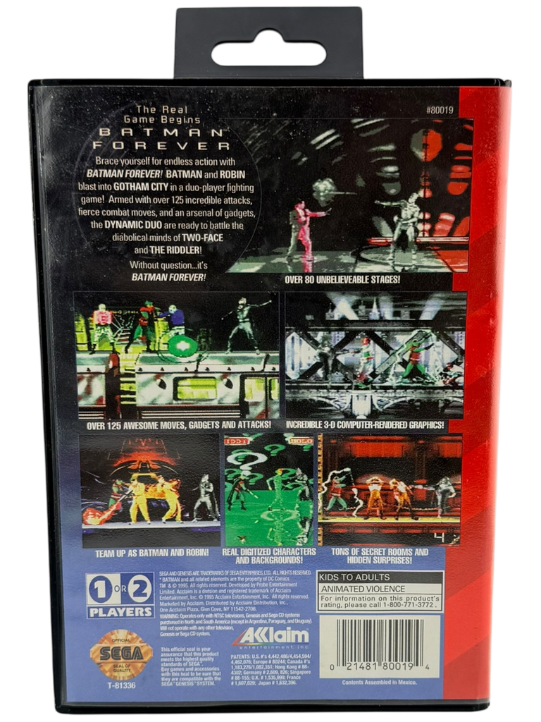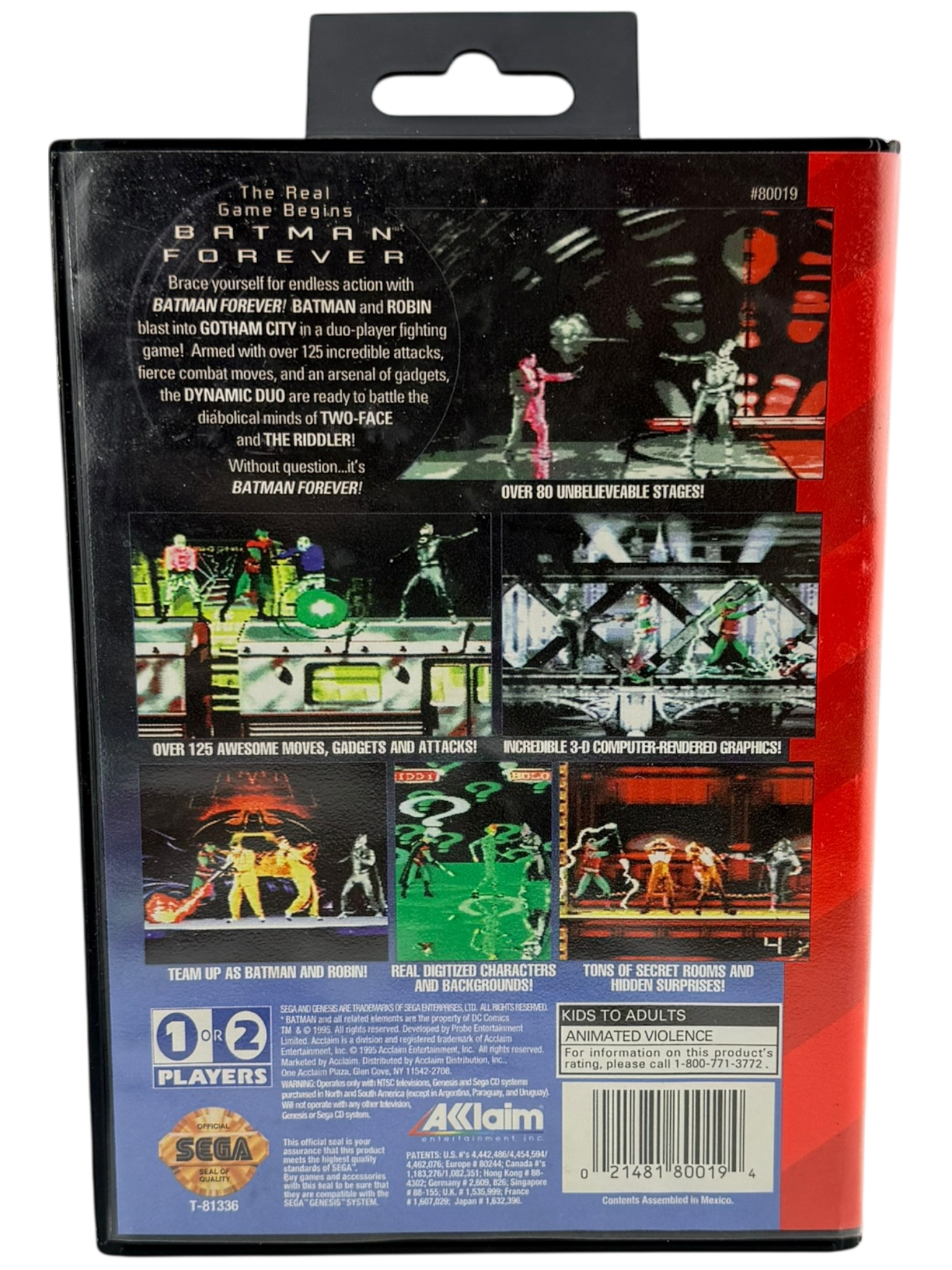 Pre-owned — Batman Forever for Sega Genesis with original game cartridge and box, no manual included. The cartridge and box are intact; see photos for specific cosmetic details.