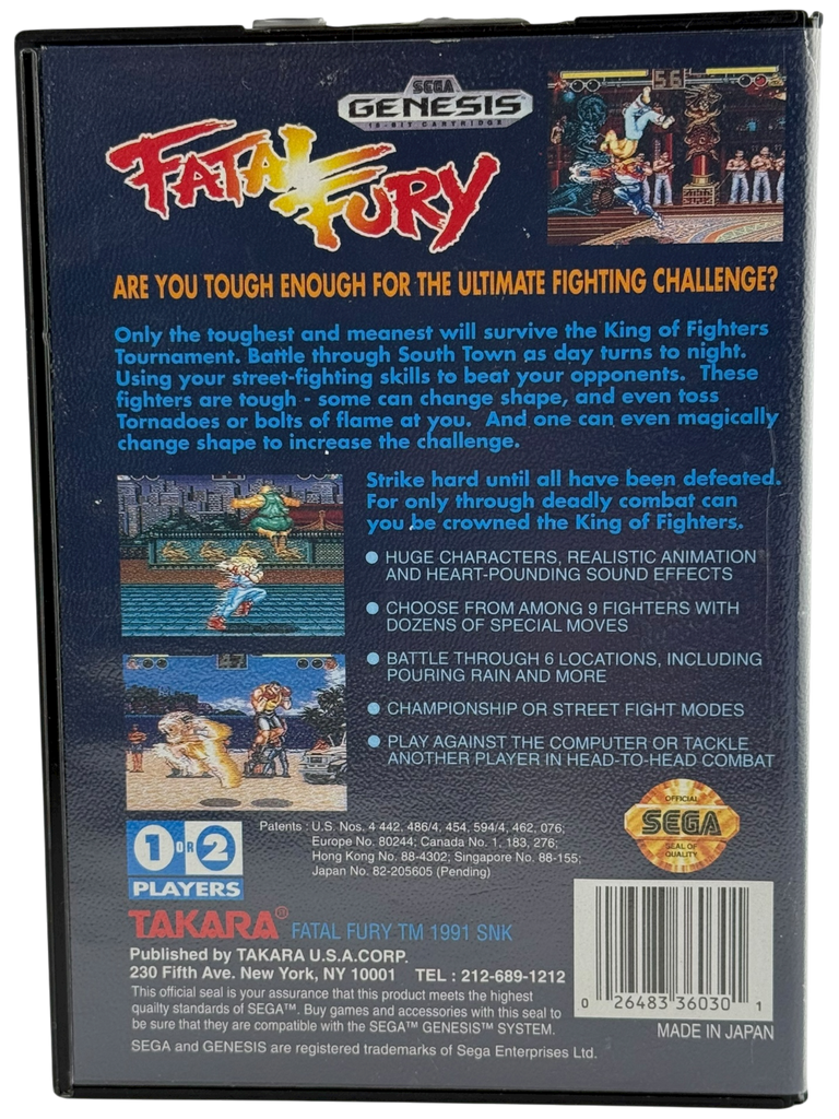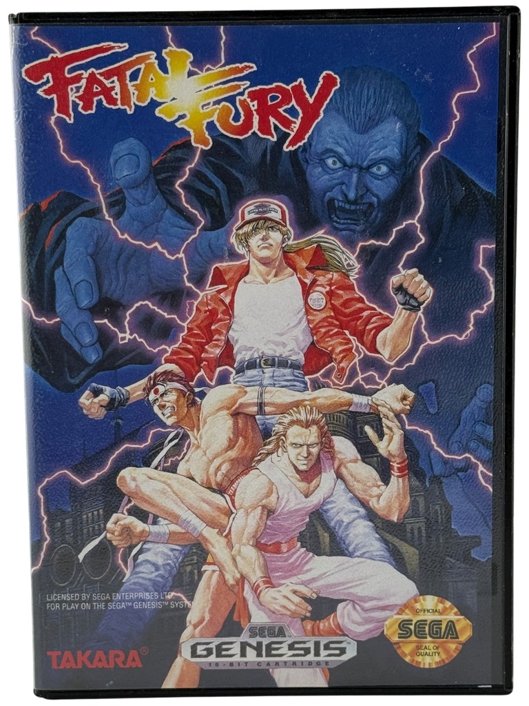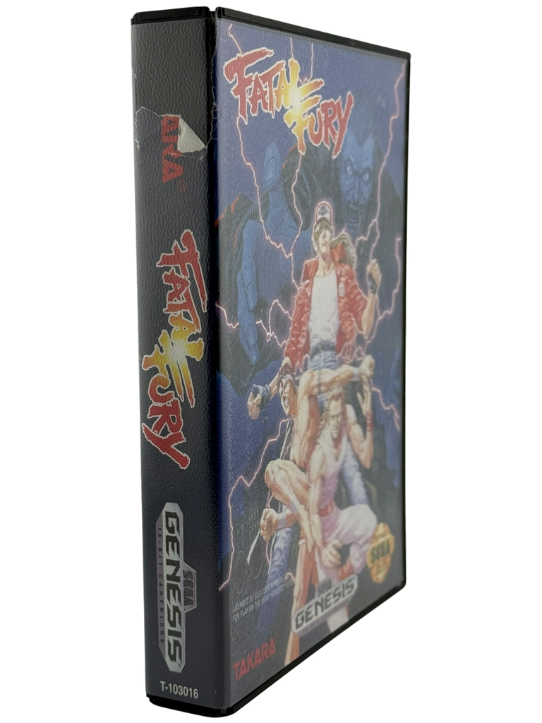 This is a copy of Fatal Fury for the Sega Genesis that includes the original game cartridge and original box with cover art. The manual is not included. The cartridge has been tested and is fully functional, showing light signs of prior use. The box and artwork are in good condition with some shelf wear consistent with age. Please review the photos provided for a detailed look at the item’s condition.