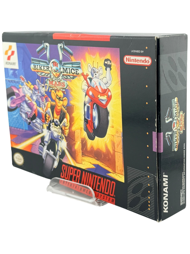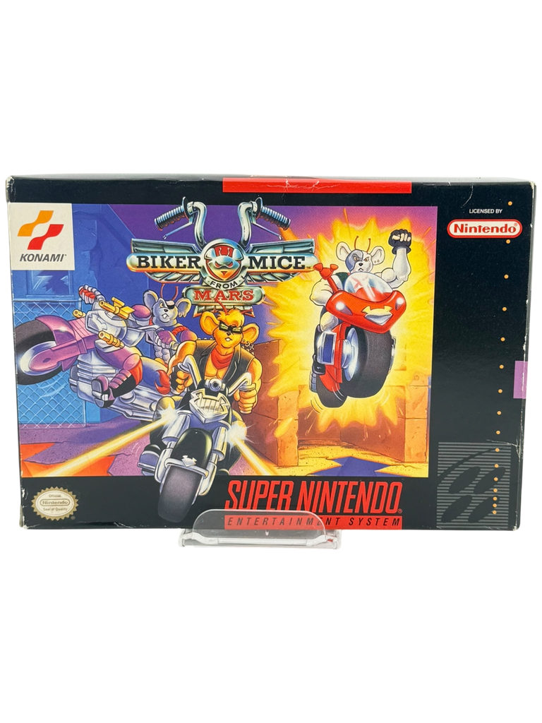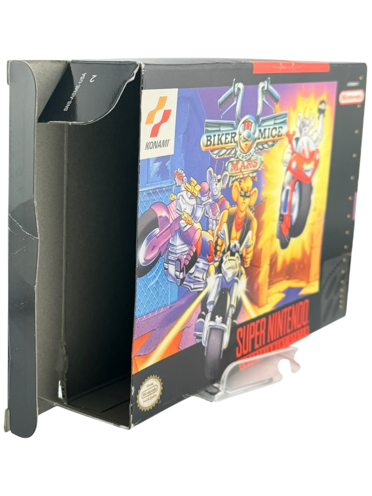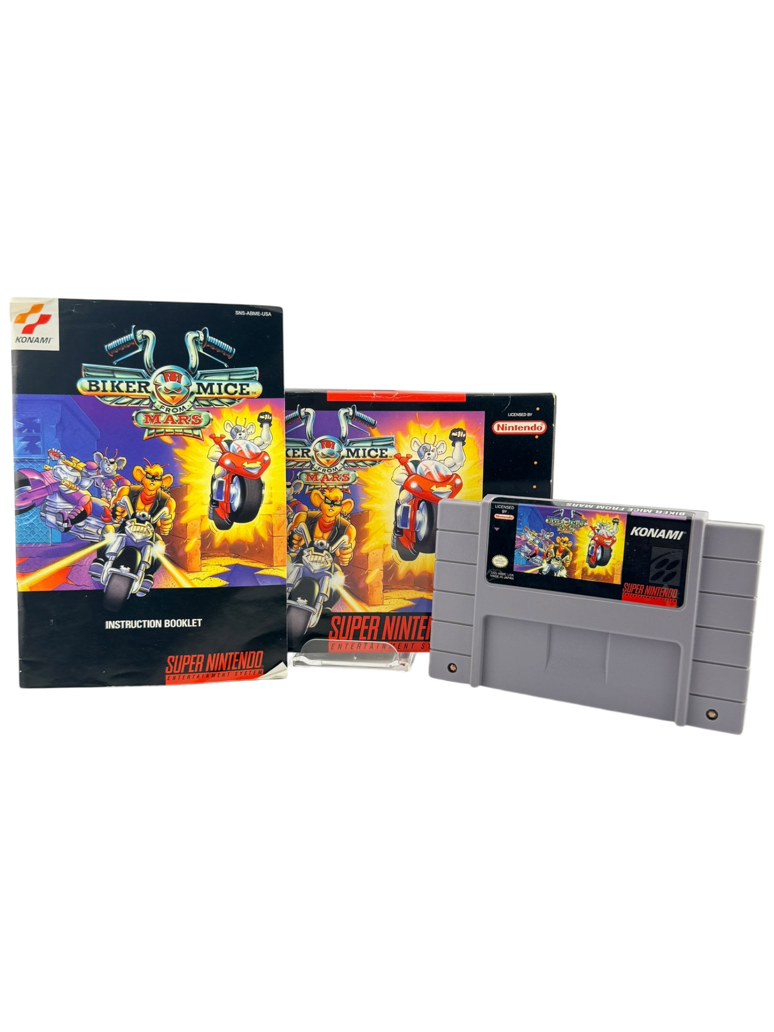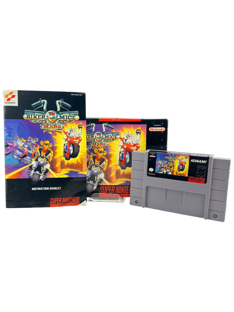This listing is for a Complete in Box (CIB) Super Nintendo (SNES) copy of Biker Mice From Mars. The game cartridge has been tested and is fully functional. This set includes the original game cartridge, original box, and original instruction manual. All components show light to moderate wear consistent with age and careful use. The box and manual may exhibit minor edge wear, creasing, or surface wear typical of vintage SNES packaging. Please review all photos carefully for exact cosmetic condition, as they depict the actual items you will receive.