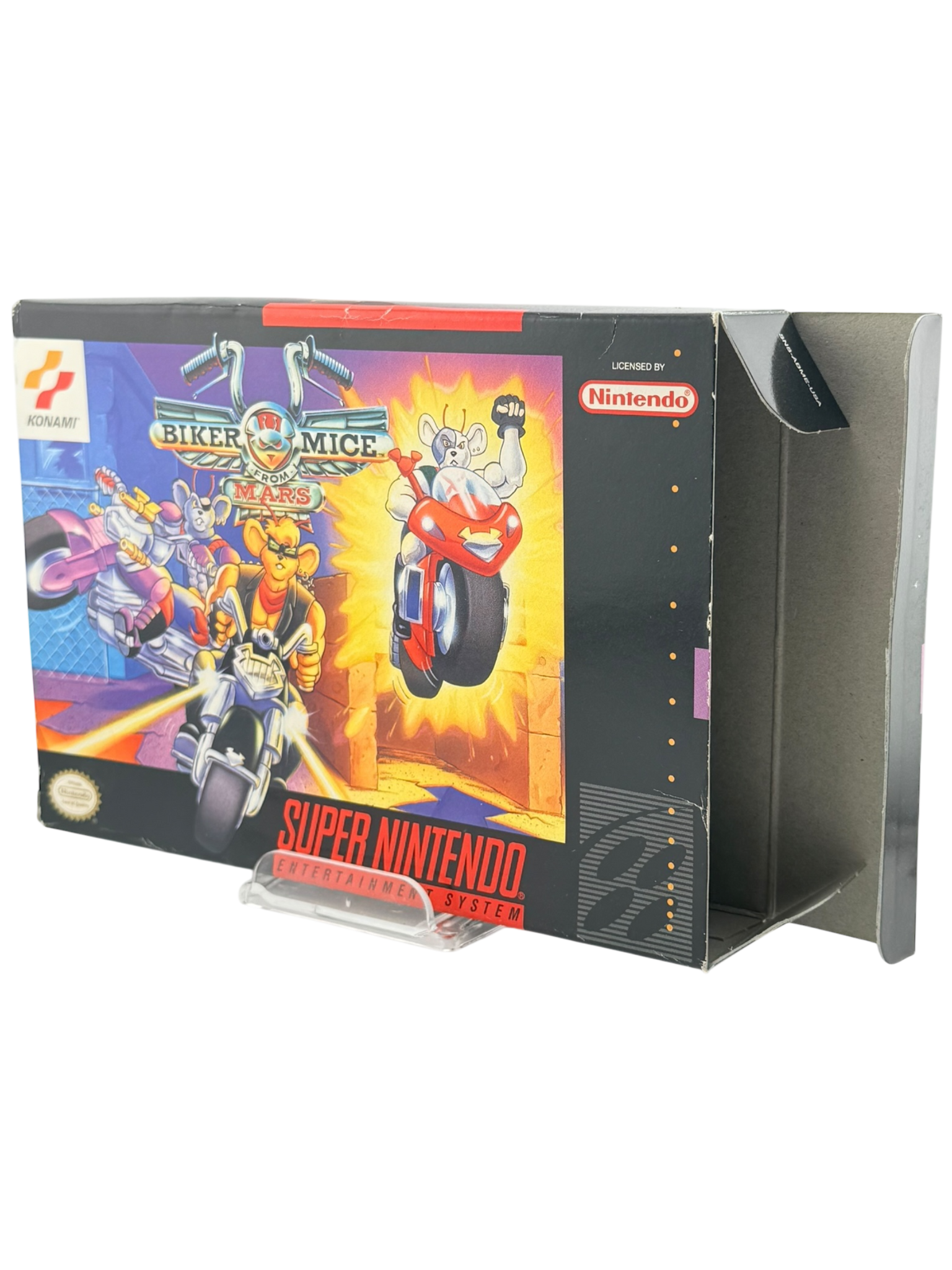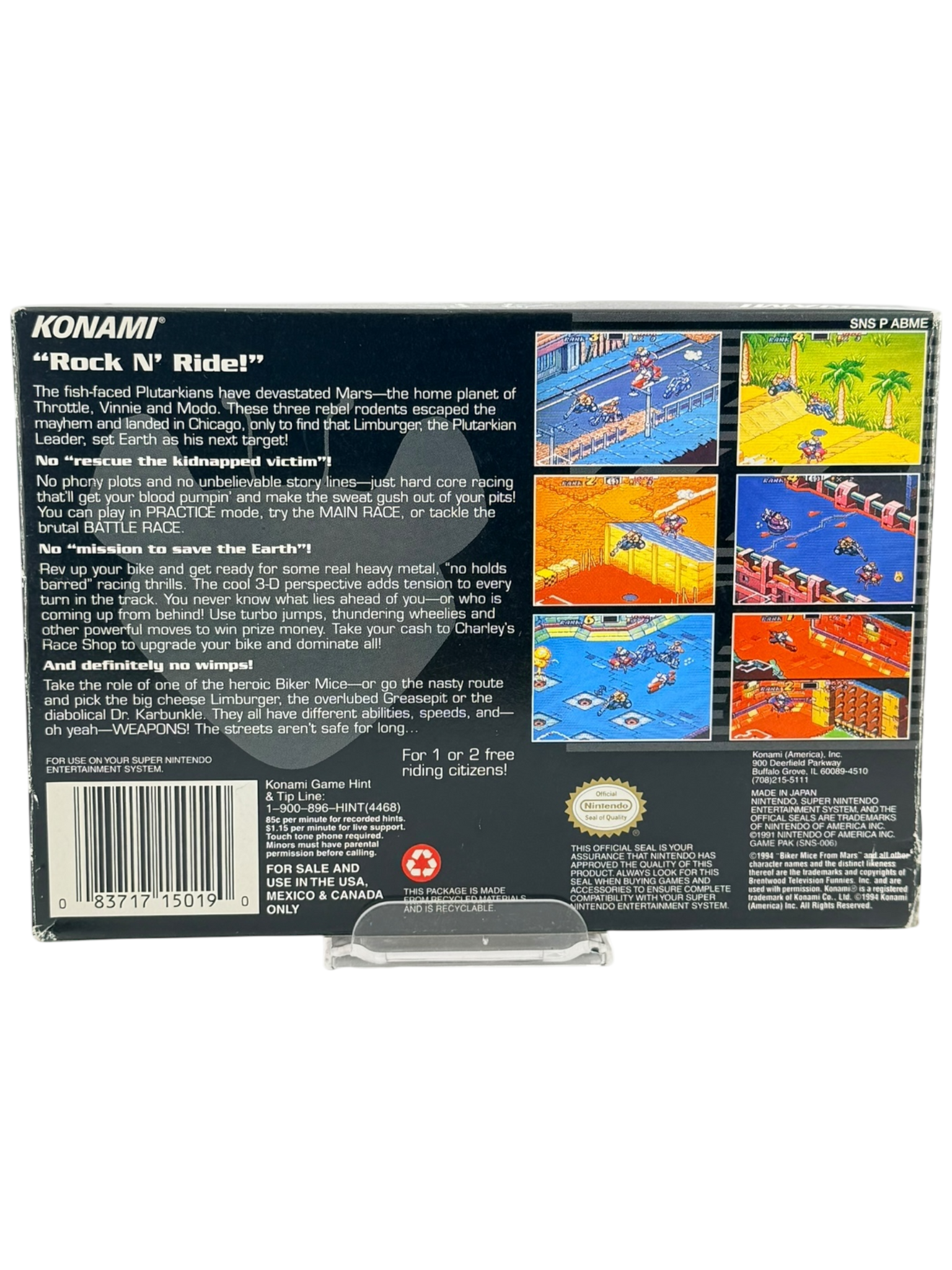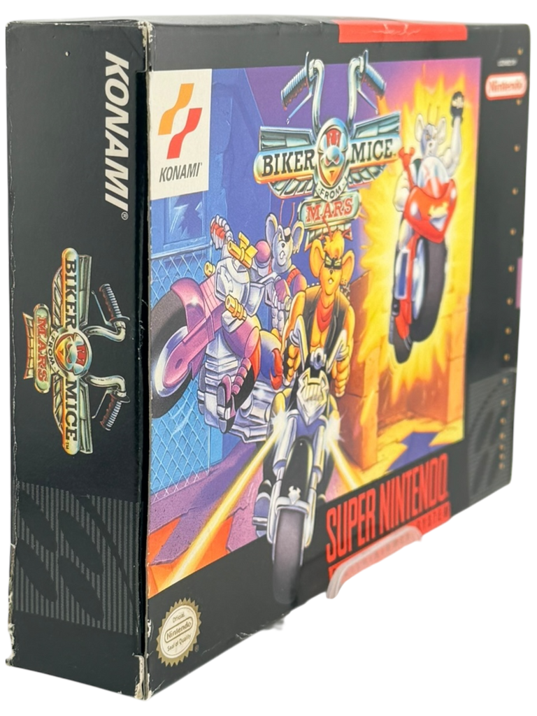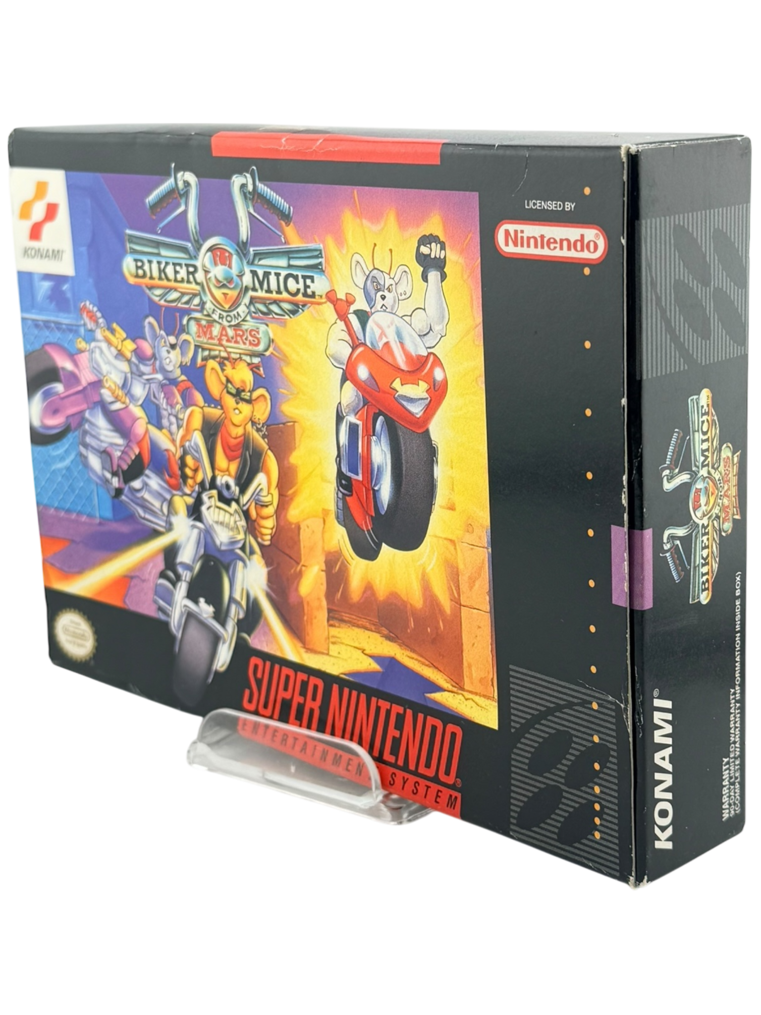 This listing is for a Complete in Box (CIB) Super Nintendo (SNES) copy of Biker Mice From Mars. The game cartridge has been tested and is fully functional. This set includes the original game cartridge, original box, and original instruction manual. All components show light to moderate wear consistent with age and careful use. The box and manual may exhibit minor edge wear, creasing, or surface wear typical of vintage SNES packaging. Please review all photos carefully for exact cosmetic condition, as they depict the actual items you will receive.