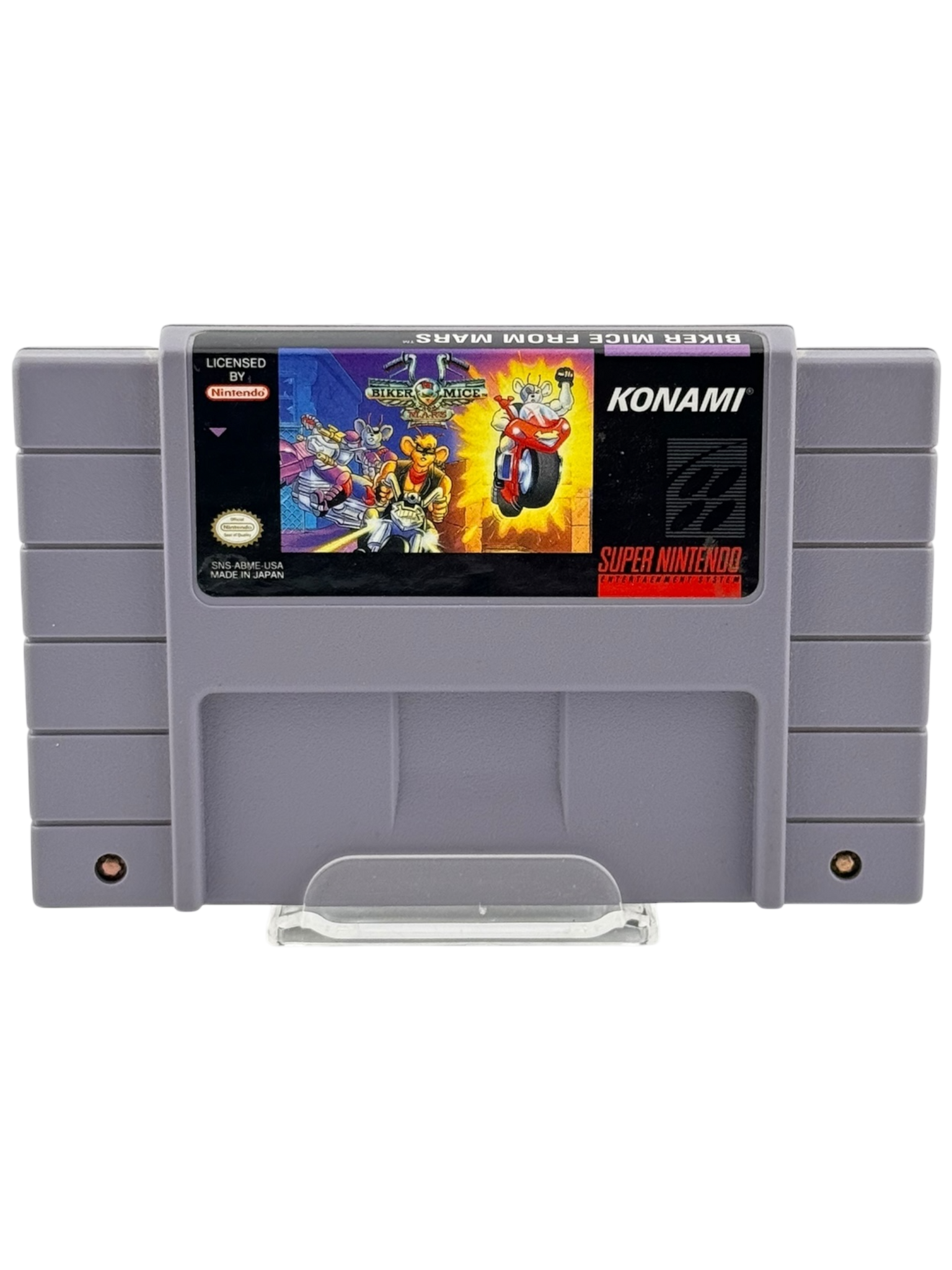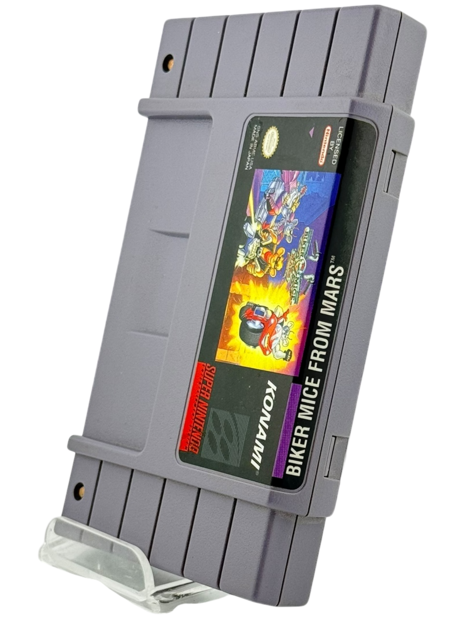Biker Mice From Mars brings the high-octane energy of the cult-classic animated series to the Super Nintendo in a fast-paced blend of racing and combat. Players choose between Throttle, Modo, or Vinnie and tear through futuristic tracks while battling rival bikers, dodging hazards, and boosting toward victory.