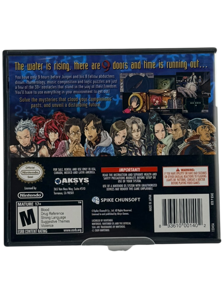 Item Description: 999: 9 Hours, 9 Persons, 9 Doors for Nintendo DS is a critically acclaimed visual novel and puzzle-adventure that blends suspenseful storytelling with escape-room style challenges. Players follow nine strangers trapped aboard a mysterious sinking ship, forced to participate in a deadly Nonary Game where every decision can mean survival or catastrophe. The game is renowned for its branching narrative, multiple endings, and mind-bending puzzles that intertwine seamlessly with its dark, psychological plot. With sharp writing, memorable characters, and twists that reward close attention, 999 stands as a landmark title in narrative-driven games. This Complete in Box copy is an excellent addition for Nintendo DS collectors and fans of mystery and story-heavy experiences, offering a gripping adventure that lingers long after the final ending is revealed.
