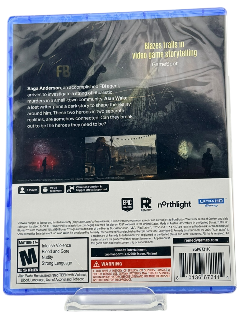 This copy of Alan Wake II: Deluxe Edition for PlayStation 5 is brand new and factory sealed. The original shrink wrap is fully intact with no tears, punctures, or signs of tampering. The game has never been opened or played and includes all original components exactly as packaged by the manufacturer. This is an authentic, unopened copy, ideal for collectors and fans of narrative-driven games.
