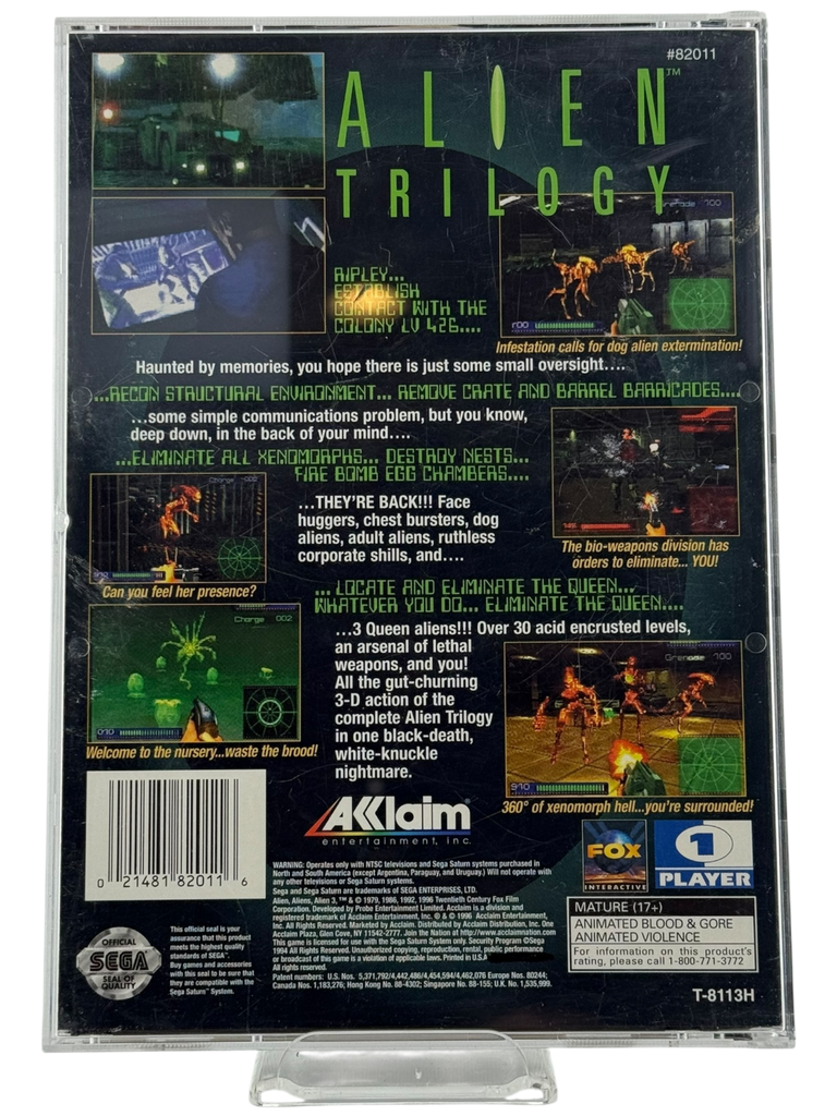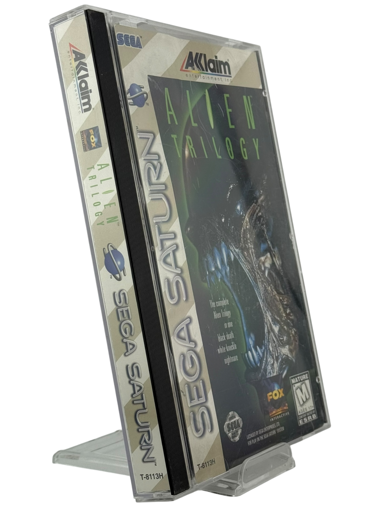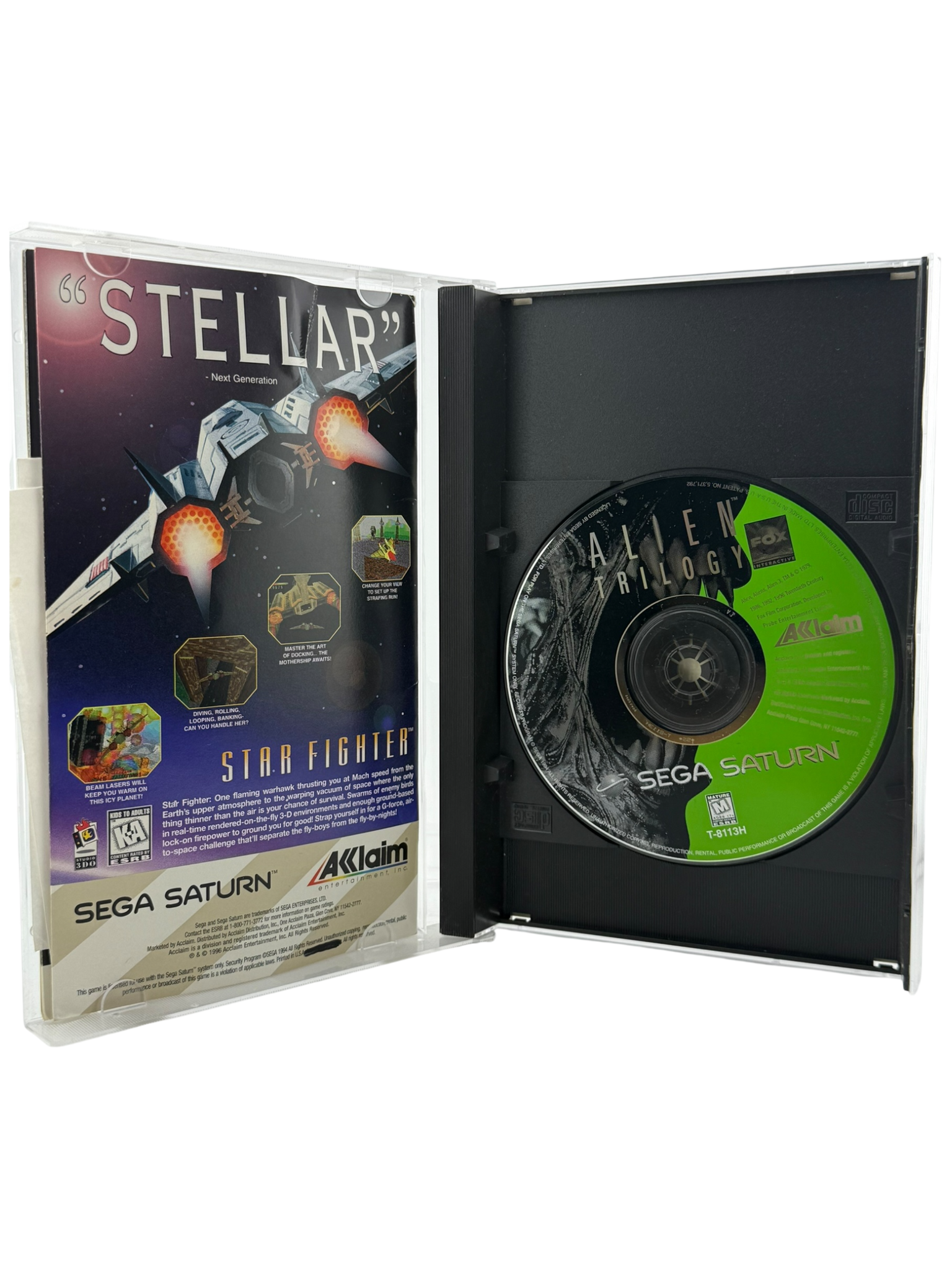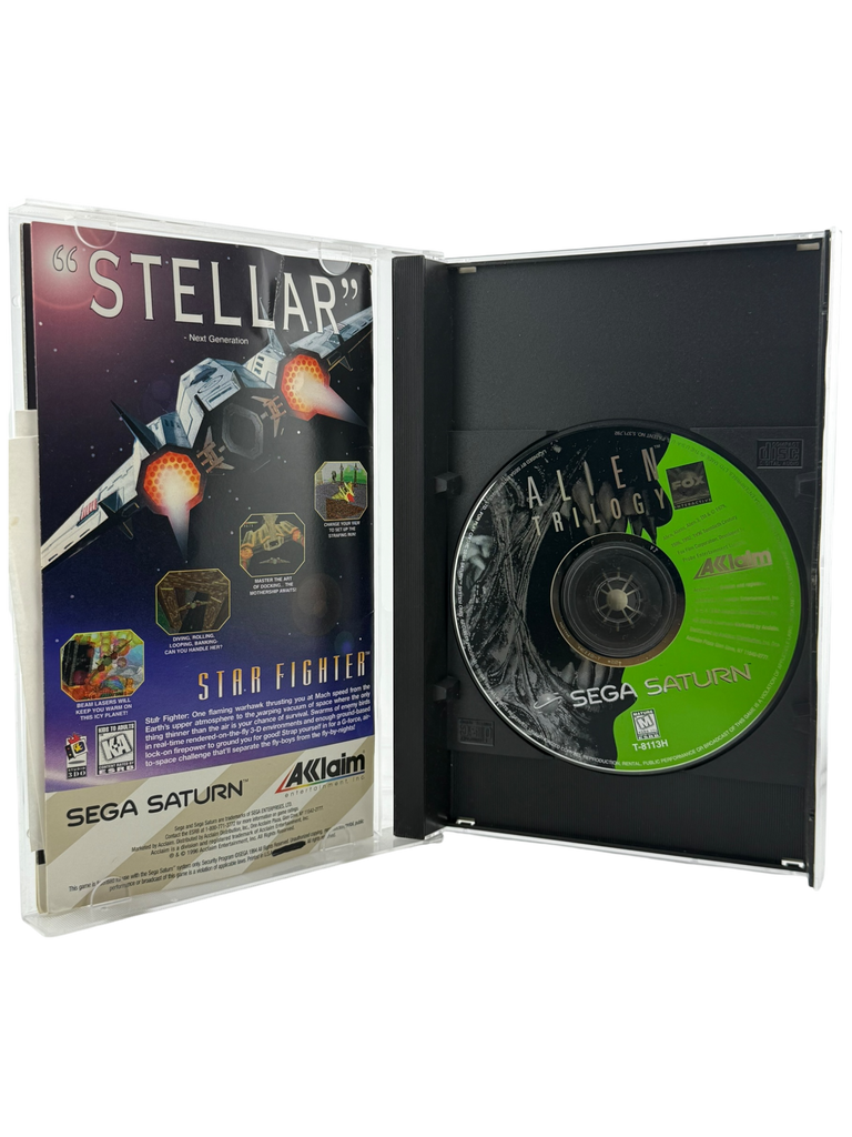 This is a complete in box copy of Alien Trilogy for the Sega Saturn. It includes the original game disc, instruction manual, and original Saturn case with cover art. All components are authentic and have been quality-checked. The disc is clean and tested for full functionality, the manual is in very good shape, and the case shows minor shelf wear. Please review photos for exact item condition.