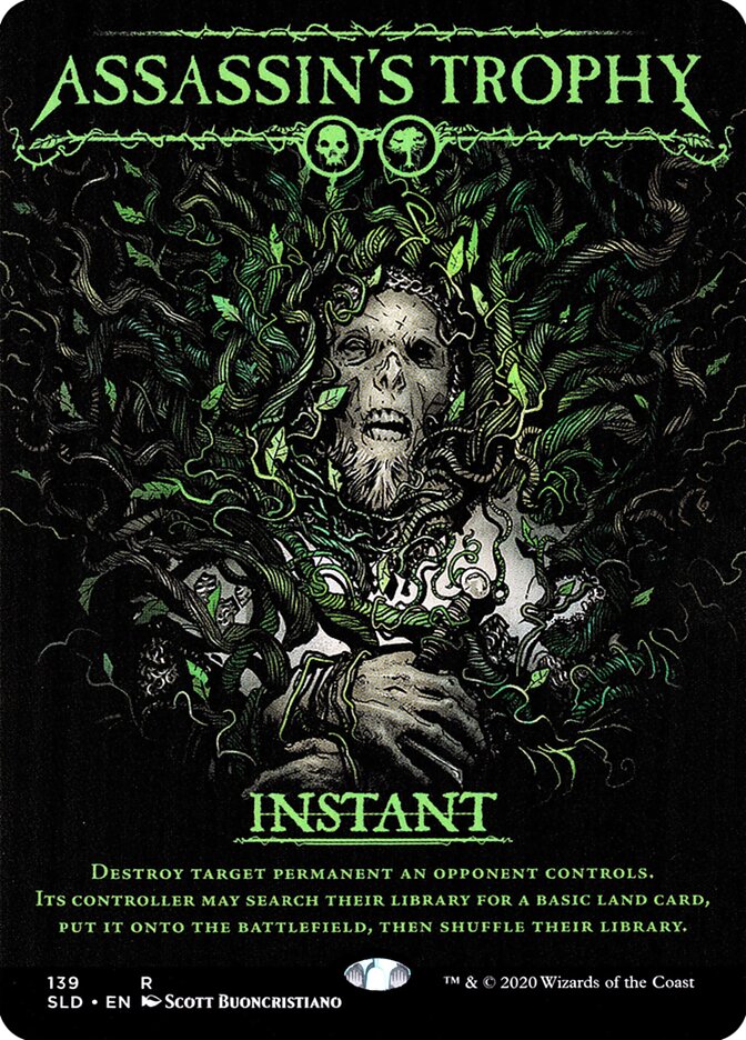Item Description: Assassin's Trophy showcases the flavor, strategy, and unique mechanics of Secret Lair Singles. Whether you're sleeving up a competitive deck, bolstering your Commander collection, or diving into a nostalgic binder of old favorites, this card will feel right at home.