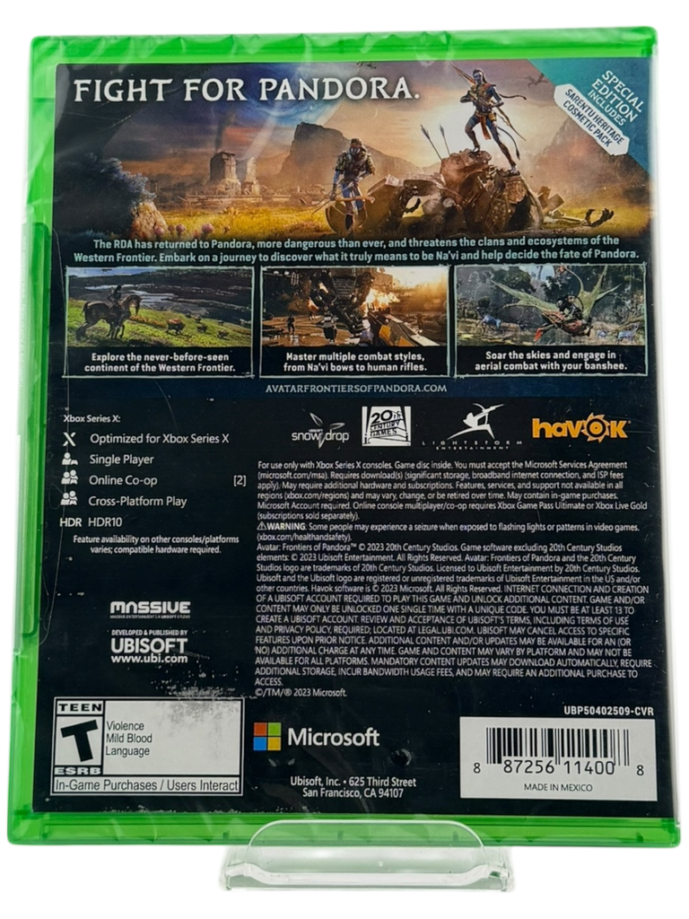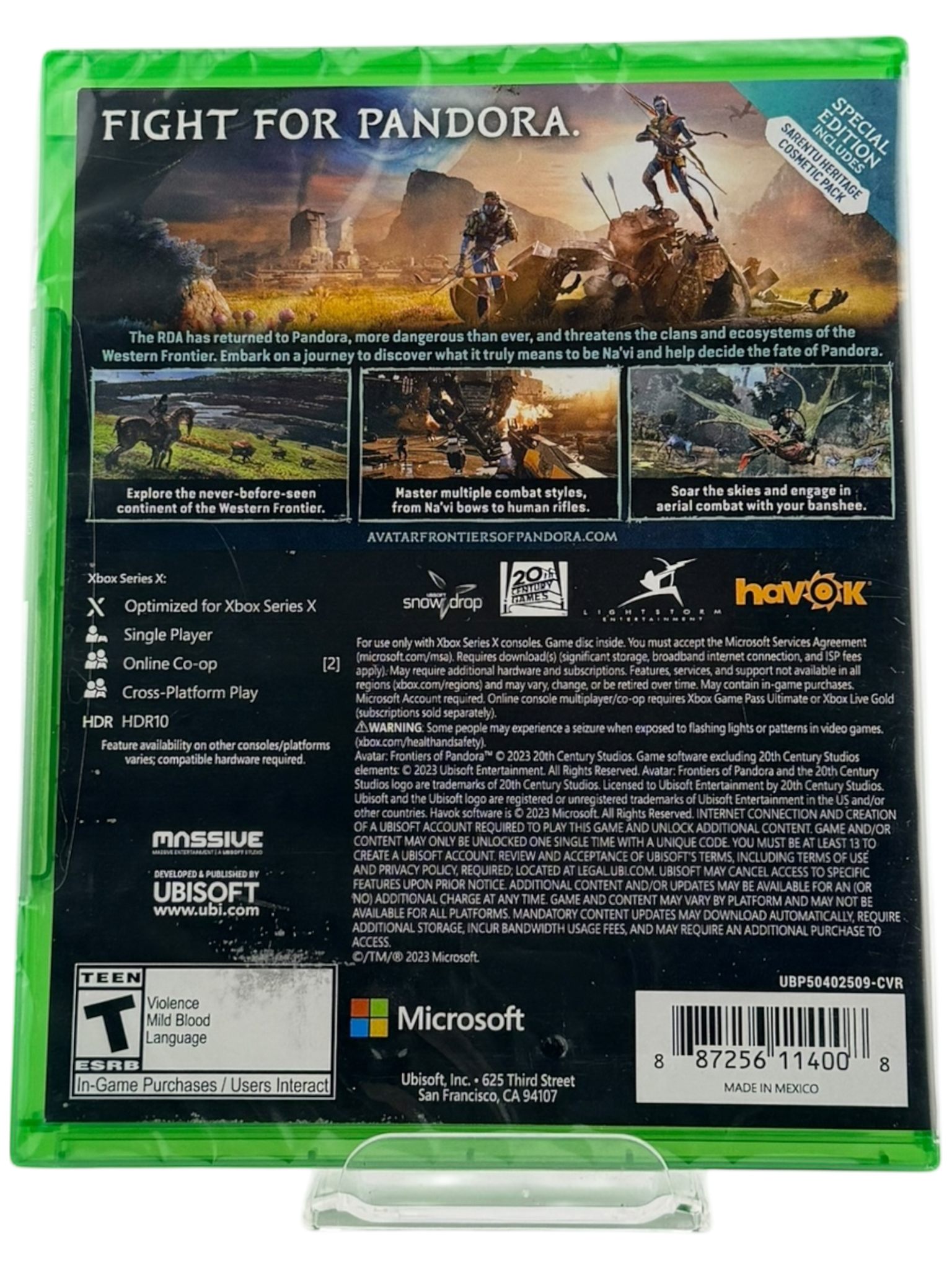 Item Description: Avatar: Frontiers of Pandora for Xbox Series X is an expansive first-person action-adventure set in the breathtaking world of Pandora. Built exclusively for current-generation hardware, the game immerses players in a stunning open world filled with towering jungles, alien wildlife, and dynamic ecosystems inspired by James Cameron’s Avatar universe. You play as a Na’vi raised by the RDA, rediscovering your heritage while fighting to protect Pandora from human exploitation. Featuring fluid traversal, intense combat using both Na’vi and human technology, and a richly detailed environment brought to life with advanced visuals and sound design, the experience is both cinematic and deeply immersive. This brand new, factory sealed copy is ideal for collectors and players looking to experience Pandora at its most vivid, offering pristine shelf appeal alongside a visually spectacular adventure on Xbox Series X.