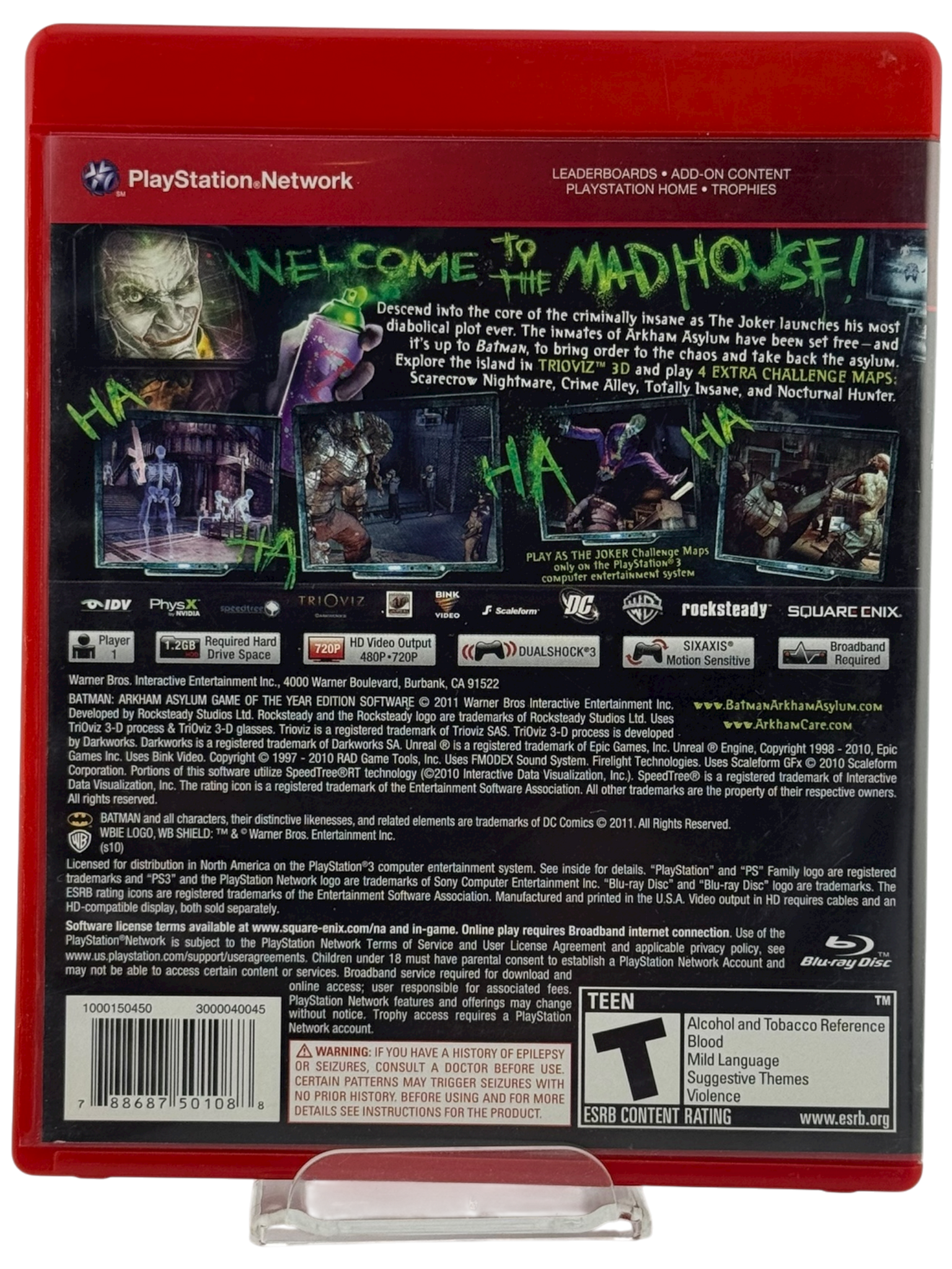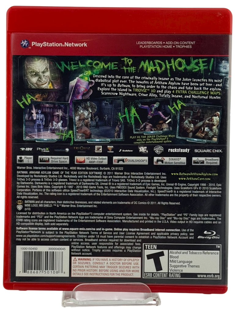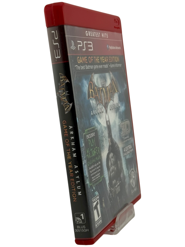 This listing is for Batman: Arkham Asylum [Game of the Year Edition, Greatest Hits] for the Sony PlayStation 3, complete in box (CIB). It includes the original game disc, manual, and case. The disc has been tested to ensure proper functionality, and all components are authentic PlayStation 3 releases—not reproductions. Please review photos carefully to see the exact condition of the disc, case, and manual.