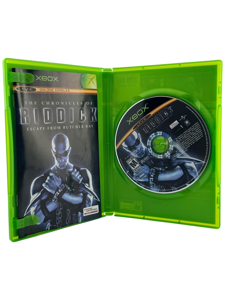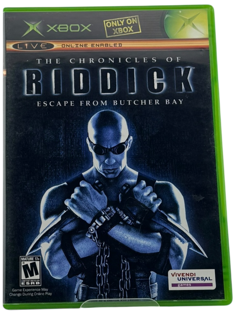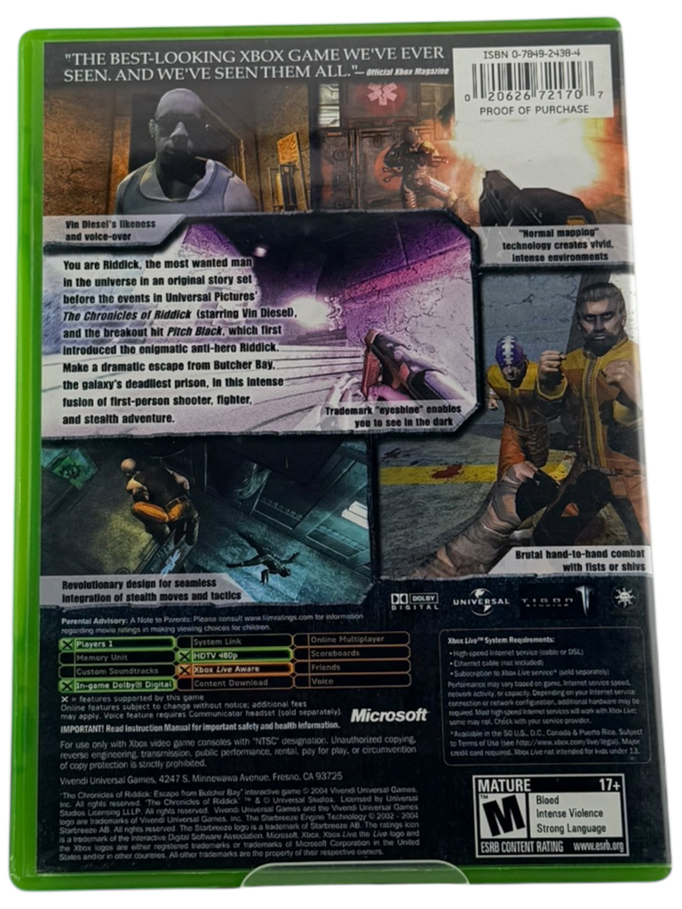Item Description: The Chronicles of Riddick: Escape from Butcher Bay for Xbox is a critically acclaimed action-adventure that masterfully blends first-person combat, stealth, and narrative-driven gameplay. Serving as a prequel to the films, the game follows antihero Riddick as he attempts a daring escape from the infamous Butcher Bay prison, a brutal facility filled with rival inmates, guards, and dark secrets. Known for its immersive atmosphere, cinematic presentation, and innovative mix of melee combat, shooting, and stealth mechanics, the game set a new standard for licensed titles upon release. Strong voice acting, including Vin Diesel reprising his role, and thoughtful level design elevate the experience well beyond typical movie tie-ins. This Complete in Box copy is a standout addition for Xbox collectors and fans of story-rich action games, offering one of the system’s most respected and memorable adventures.