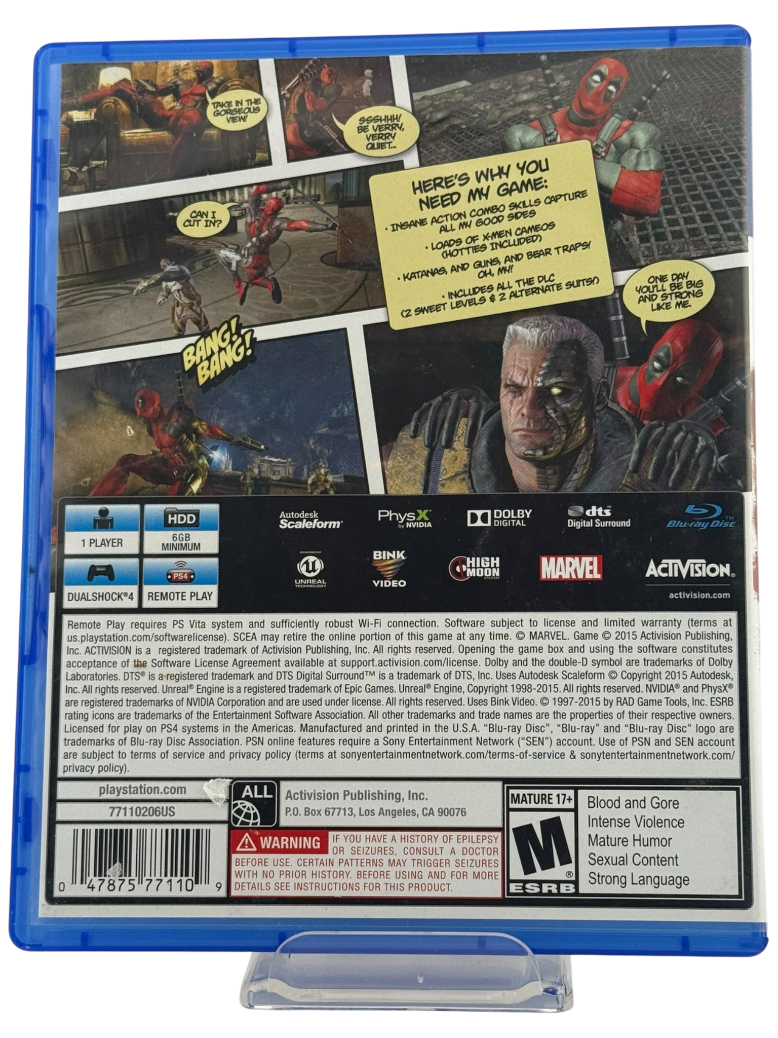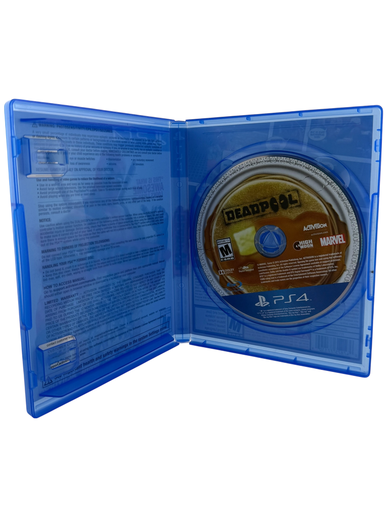 This listing is for Deadpool on PlayStation 4, complete in box. It includes the original game disc, manual, and case. The disc has been tested to ensure full functionality and authentic play on PS4 hardware. The case and manual are in solid pre-owned condition, showing only light wear consistent with normal use. Please review the photos for the most accurate representation of condition.