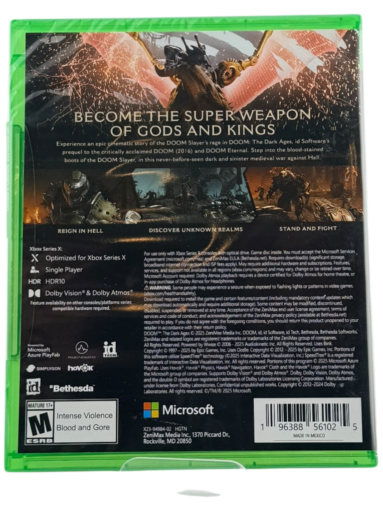 As a brand-new, sealed copy, this release is ideal for players eager to experience DOOM’s next evolution or collectors looking to secure a pristine example of one of the franchise’s most ambitious entries. A bold fusion of old-world brutality and modern shooter design, DOOM: The Dark Ages stands ready to rip and tear—medieval style.