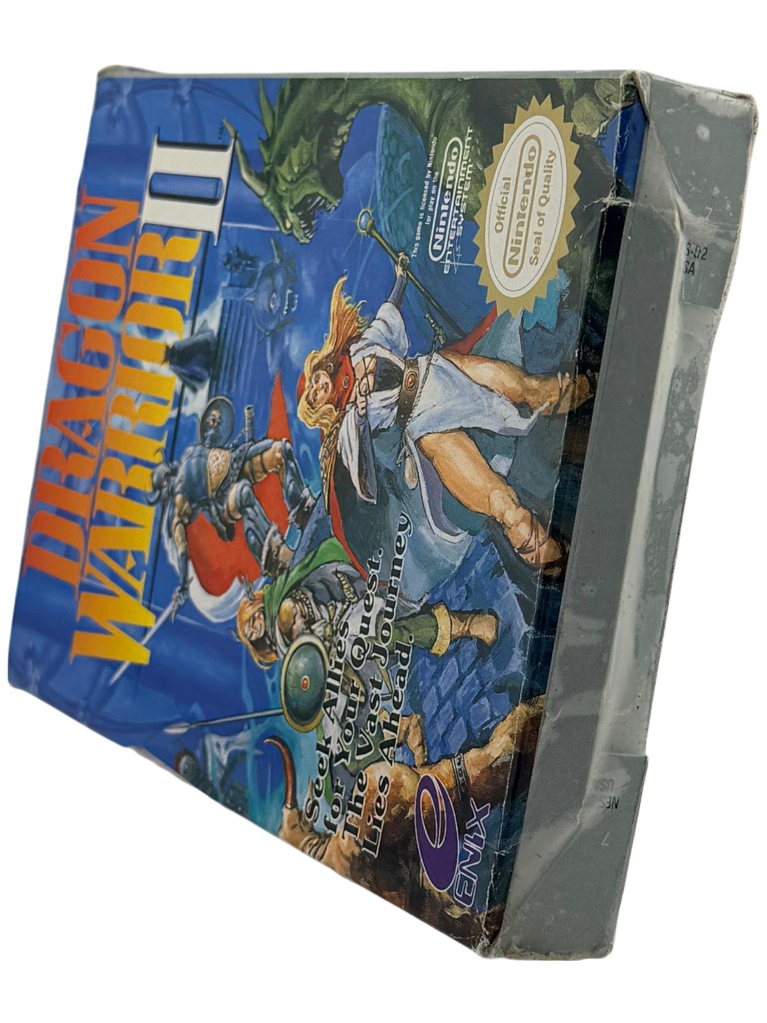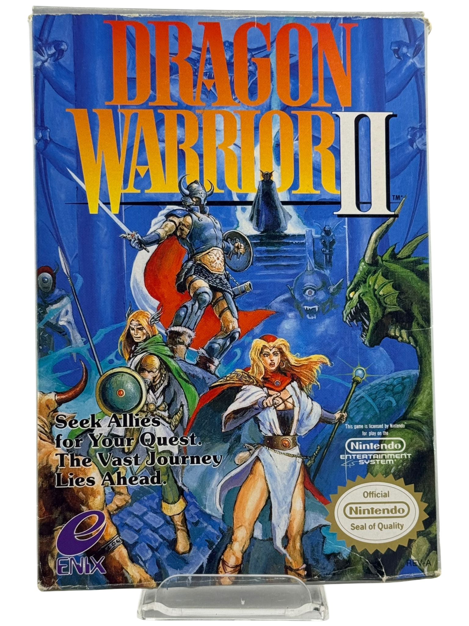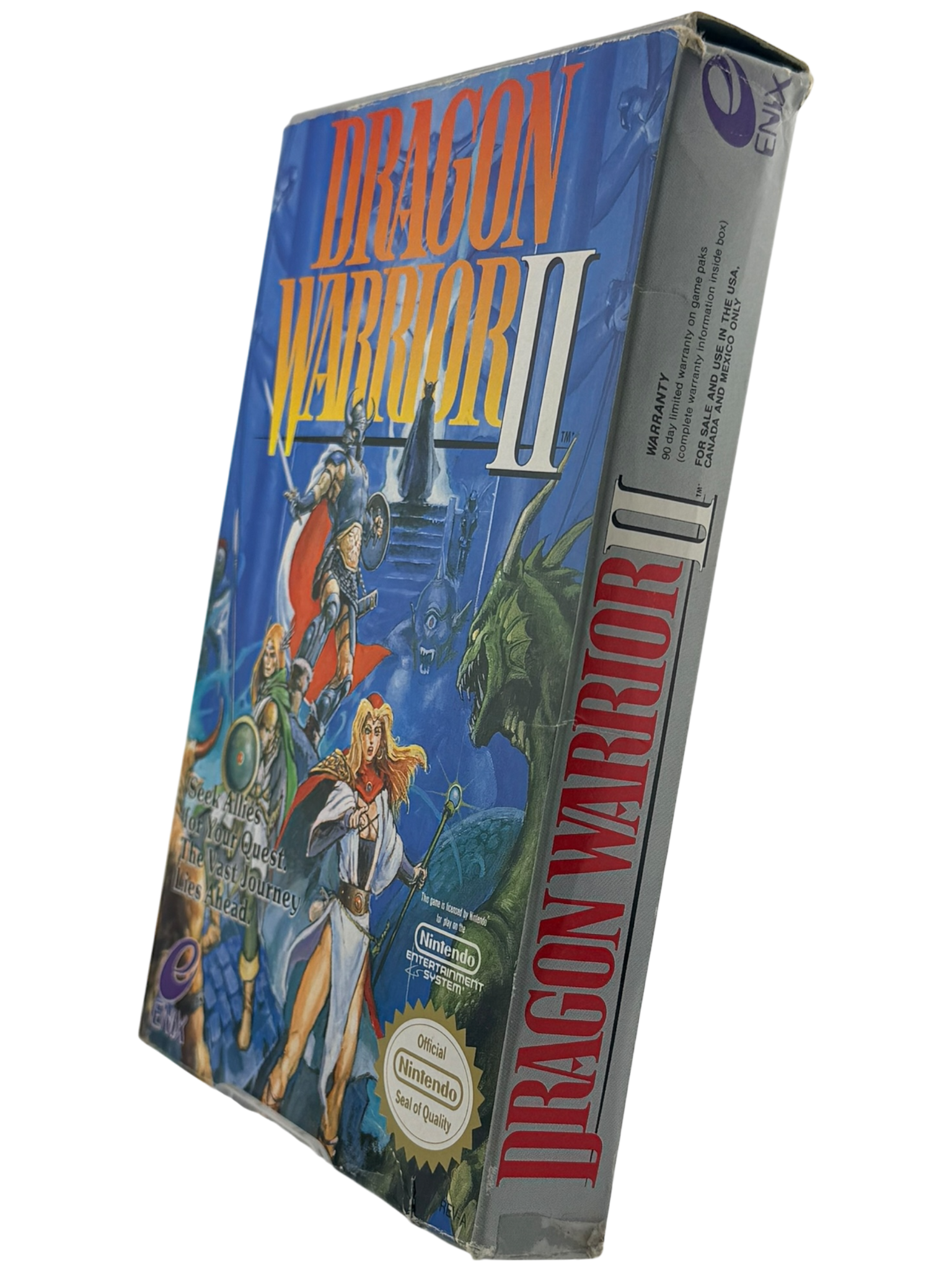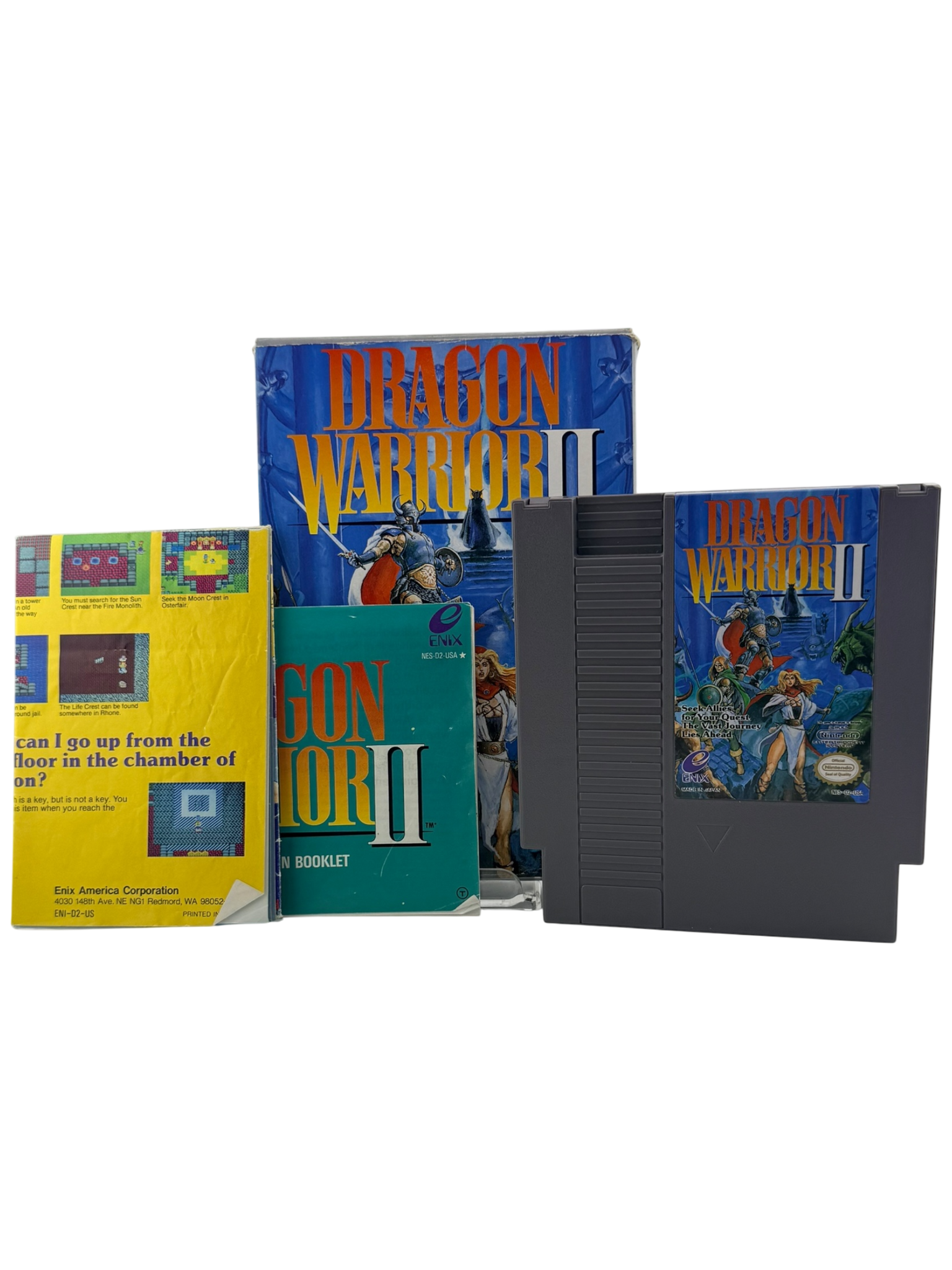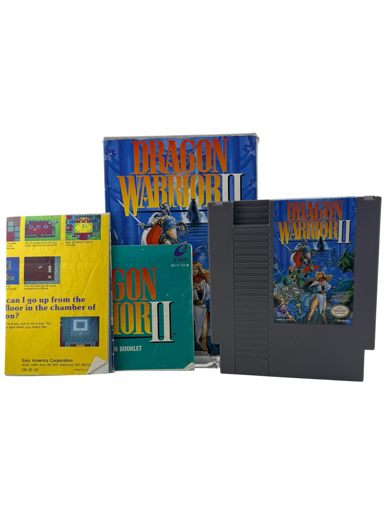 This listing includes the original Dragon Warrior II game cartridge, instruction manual, world map, and authentic Nintendo Entertainment System box with original artwork. The cartridge label is intact and clean, and the contacts have been tested and verified for reliable gameplay. The manual and map show minimal handling wear, and the box retains vibrant color and structural integrity for its age. All components are original, complete, and verified for authenticity — an outstanding example of this classic RPG release.