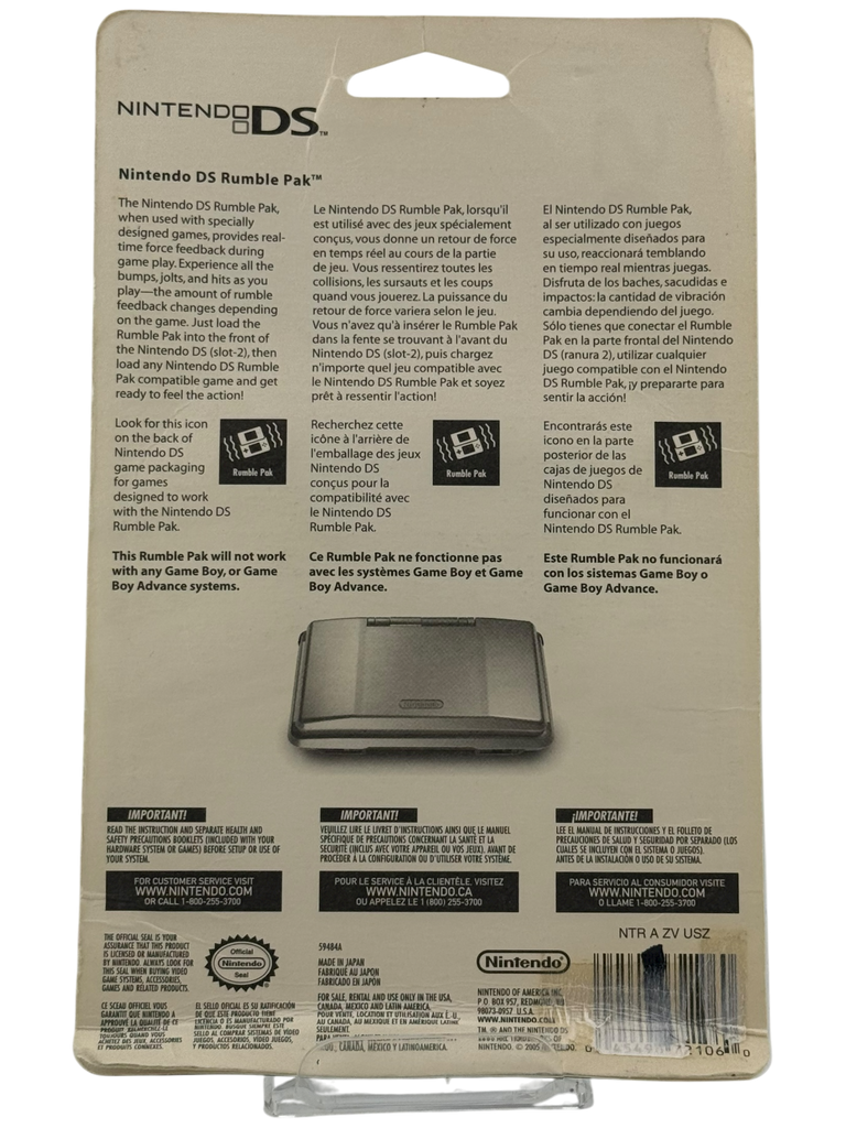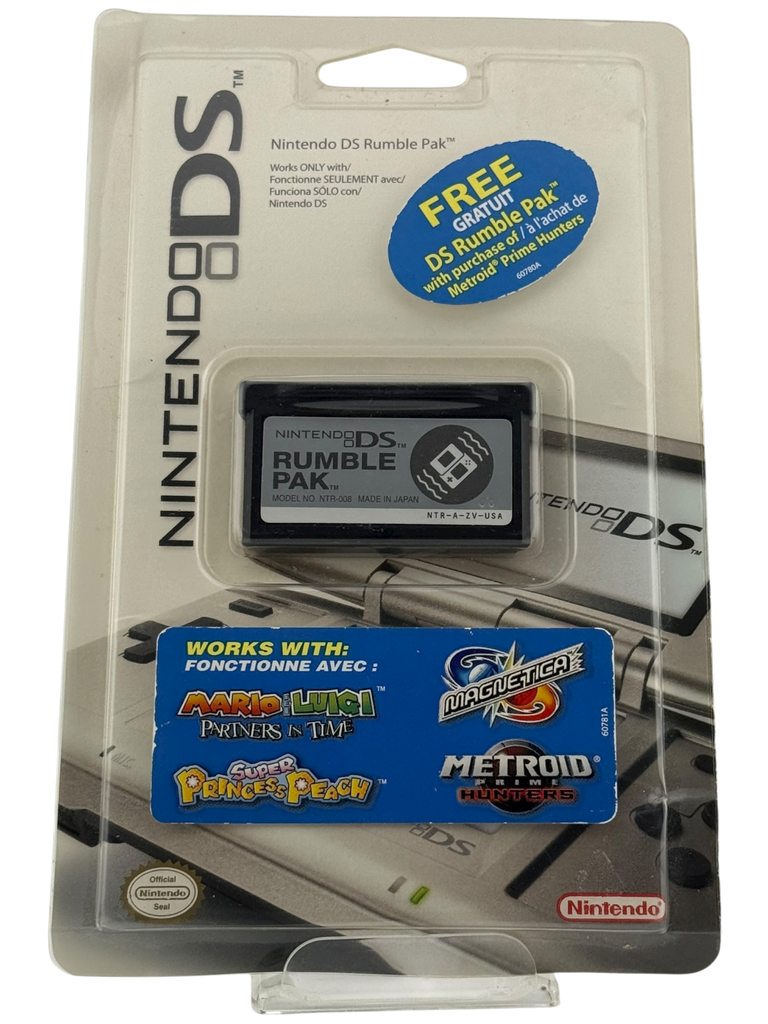 This is a brand new, factory sealed Nintendo DS Rumble Pak accessory. The item is still sealed on its original retail card packaging, with the plastic blister and backing intact. The packaging shows only minimal shelf wear, and the seal has never been broken. All contents remain in their original, untouched condition. Please review the photos provided for confirmation of the item’s sealed state.