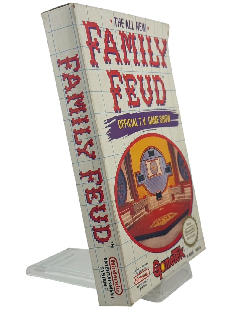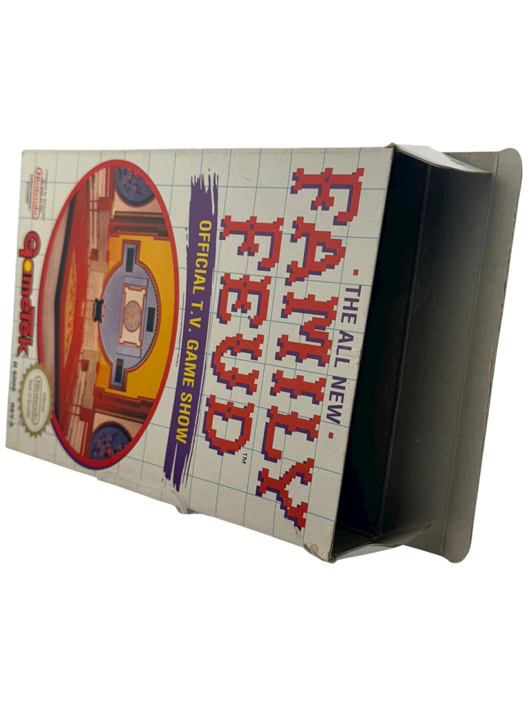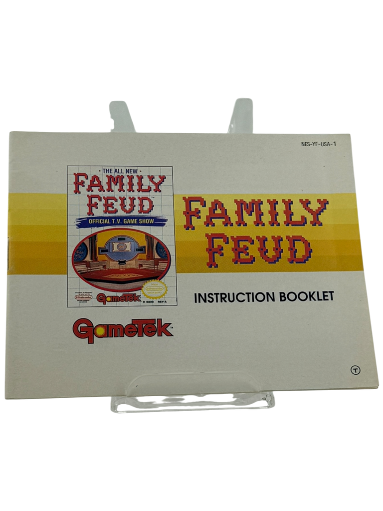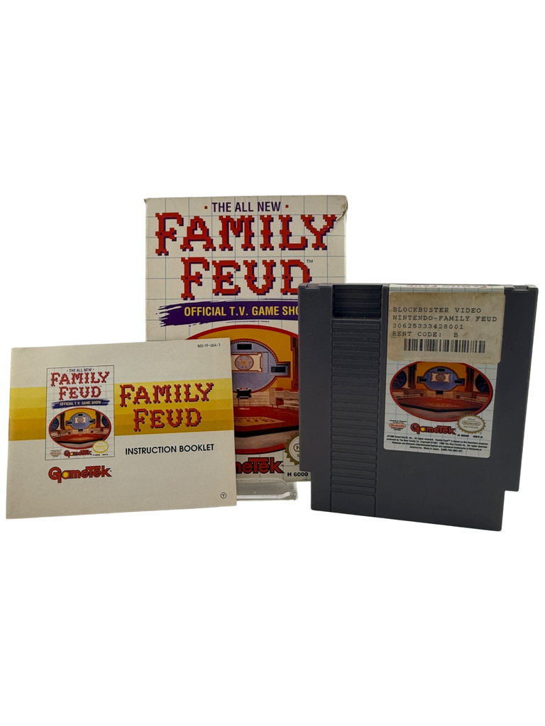 This is a complete in box copy of Family Feud for the Nintendo Entertainment System (NES). The listing includes the original game cartridge, instruction manual, and box with cover art. The cartridge has been tested and is fully functional, showing only minor wear from age. The manual and box are intact and in good condition, with some shelf wear consistent with vintage NES releases. Please review the photos provided for a clear view of the item’s condition.