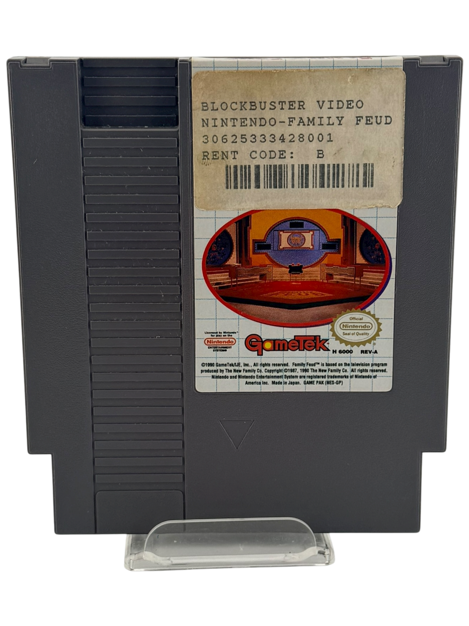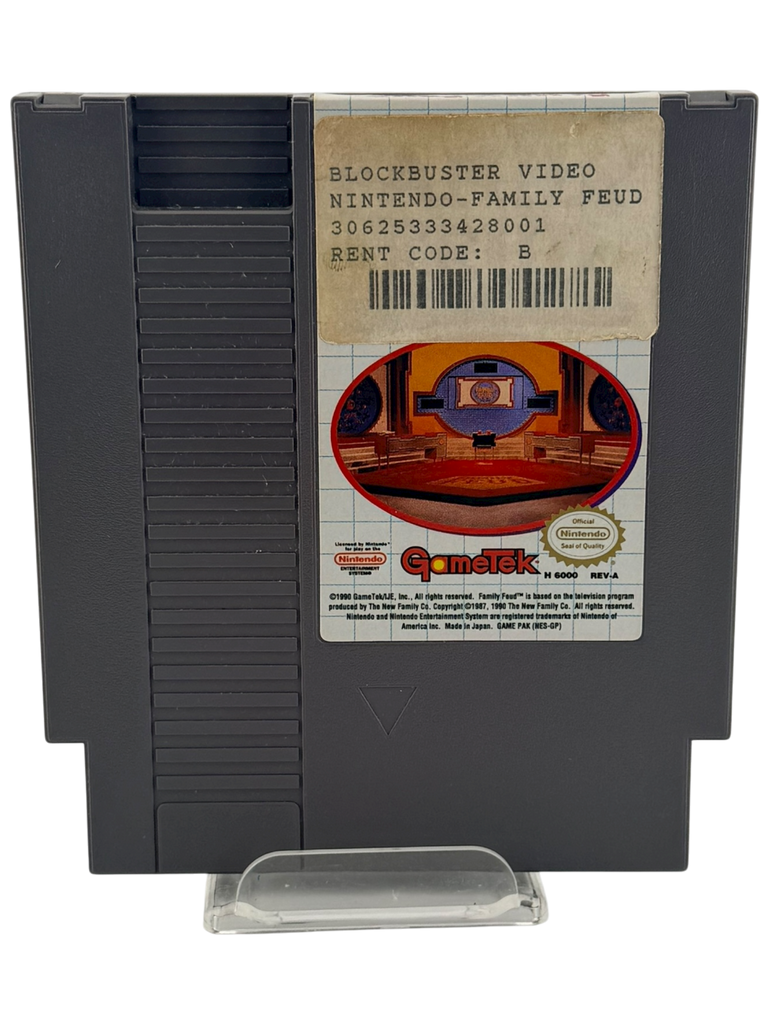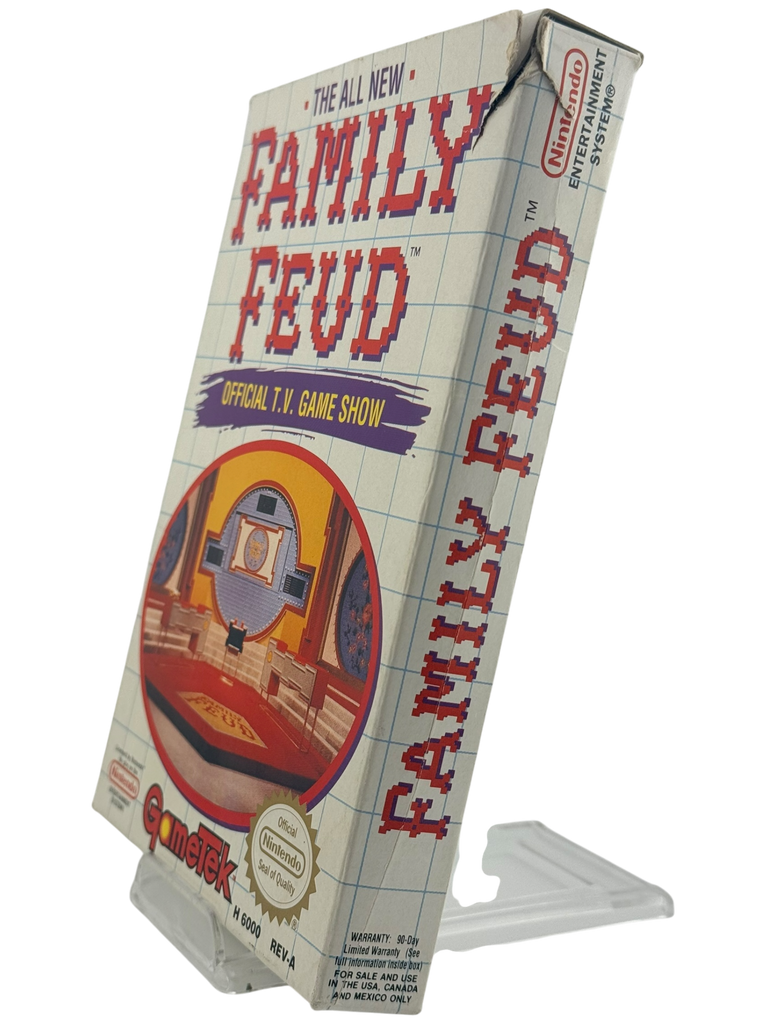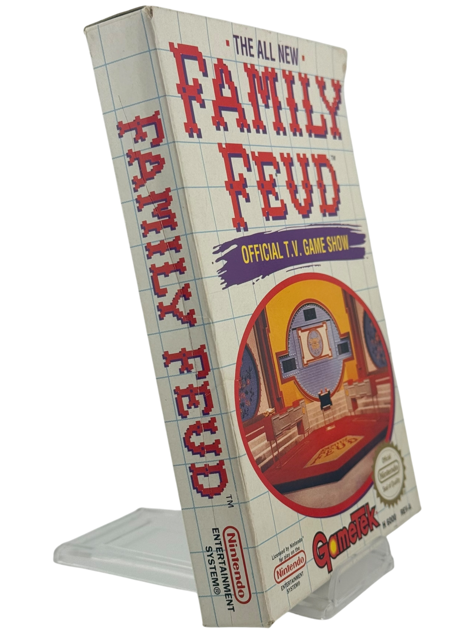 This is a complete in box copy of Family Feud for the Nintendo Entertainment System (NES). The listing includes the original game cartridge, instruction manual, and box with cover art. The cartridge has been tested and is fully functional, showing only minor wear from age. The manual and box are intact and in good condition, with some shelf wear consistent with vintage NES releases. Please review the photos provided for a clear view of the item’s condition.