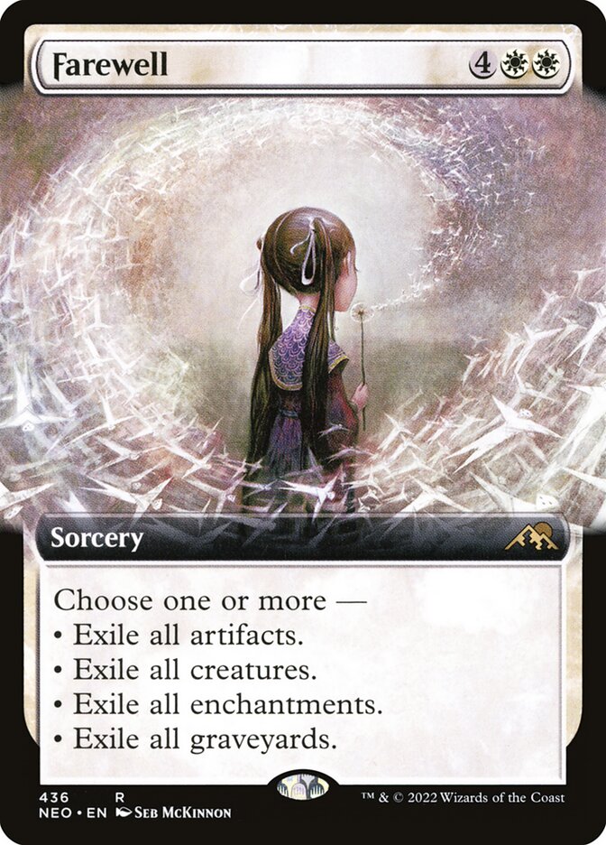 Item Description: Farewell showcases the flavor, strategy, and unique mechanics of Kamigawa: Neon Dynasty. Whether you're sleeving up a competitive deck, bolstering your Commander collection, or diving into a nostalgic binder of old favorites, this card will feel right at home.