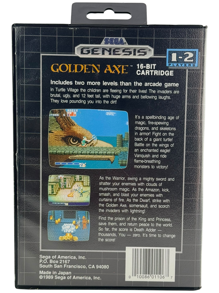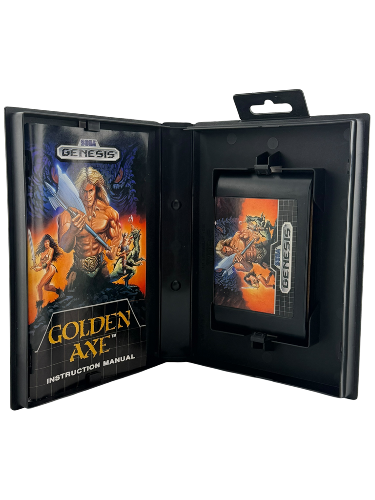 This Golden Axe listing for Sega Genesis is Complete in Box (CIB) and includes the original cartridge, original Genesis clamshell case with artwork, and the original manual. The cartridge has been cleaned, inspected, and tested to ensure excellent gameplay performance. The label remains bright and fully legible with only minor age-appropriate wear. The case and cover art are in very good condition with light shelf wear, and the manual is intact and clean with minimal handling marks. All components are authentic to the official Sega Genesis release. Please review the listing photos to see the exact item you will receive.