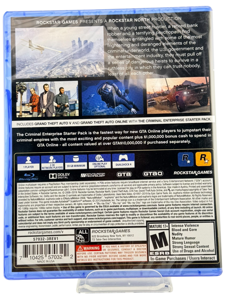 This copy of Grand Theft Auto V [Premium Edition] for PlayStation 4 is brand new and factory sealed. The original shrink wrap is fully intact with no breaks or tears, indicating the game has never been opened or used. All original components are included inside the sealed package, exactly as it left the manufacturer. This item is 100% authentic and ideal for collectors or players who want a pristine, untouched copy.