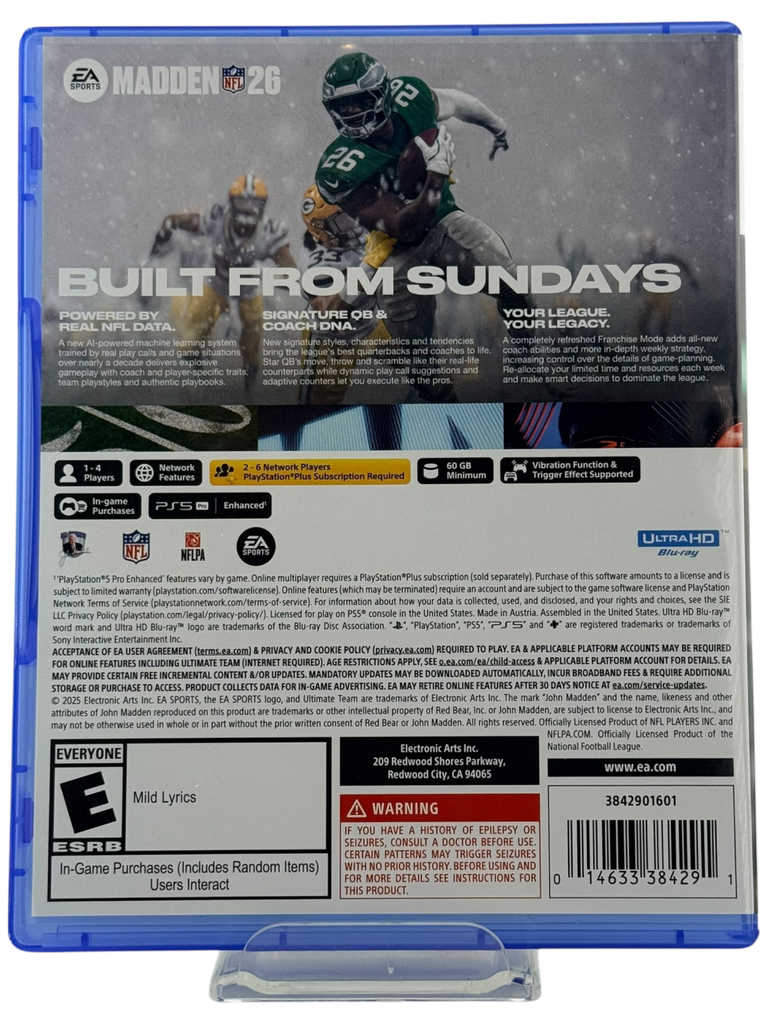 This Madden NFL 26 listing for PlayStation 5 is Complete in Box (CIB) and includes the original game disc, original PS5 case, and any original inserts that came with the retail release. The disc has been thoroughly inspected and is in excellent working condition with minimal or no visible wear. The case and cover art are in great shape, showing only light shelf wear from normal handling. All components are authentic to the official PS5 edition. Please refer to the listing photos to see the exact item you will receive.