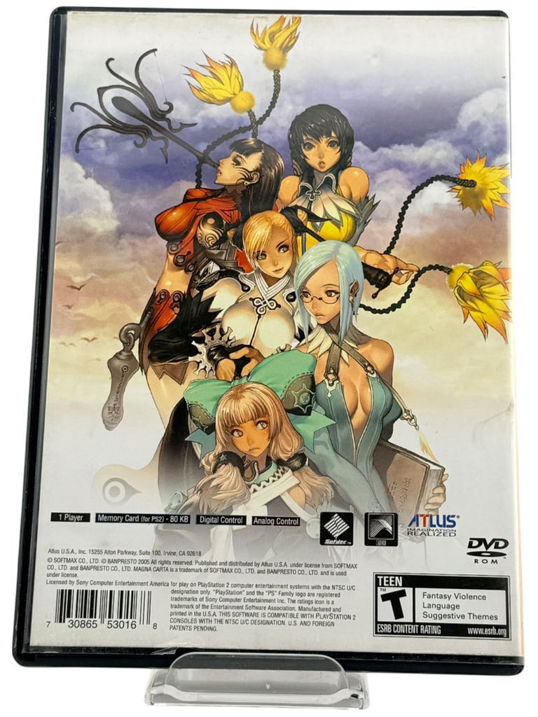 Enter a world of fantasy, politics, and warfare in Magna Carta: Tears of Blood for PlayStation 2, a captivating Japanese RPG set in a visually stunning and immersive world. Follow the story of a group of heroes as they battle dark forces and uncover the secrets of a powerful and ancient bloodline. With its real-time battle system, deep character customization, and engaging storyline, Magna Carta: Tears of Blood offers a unique RPG experience that stands out among its genre.