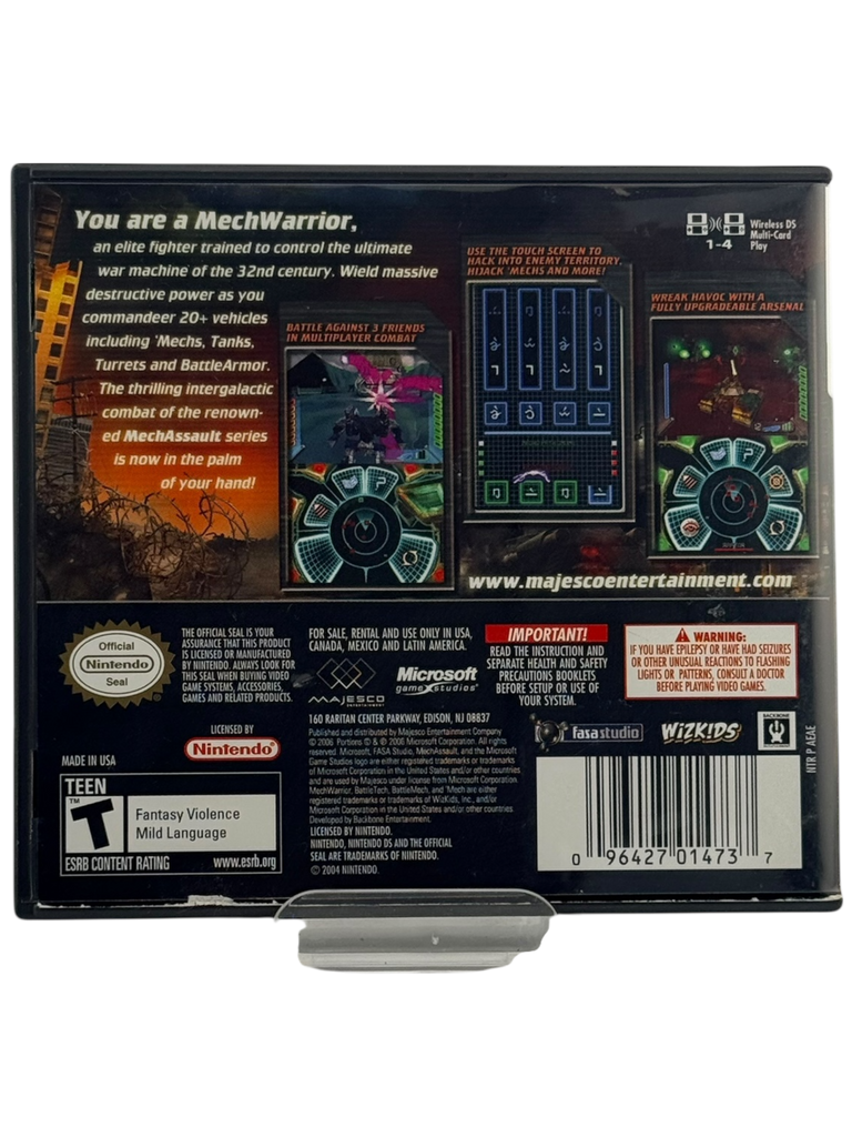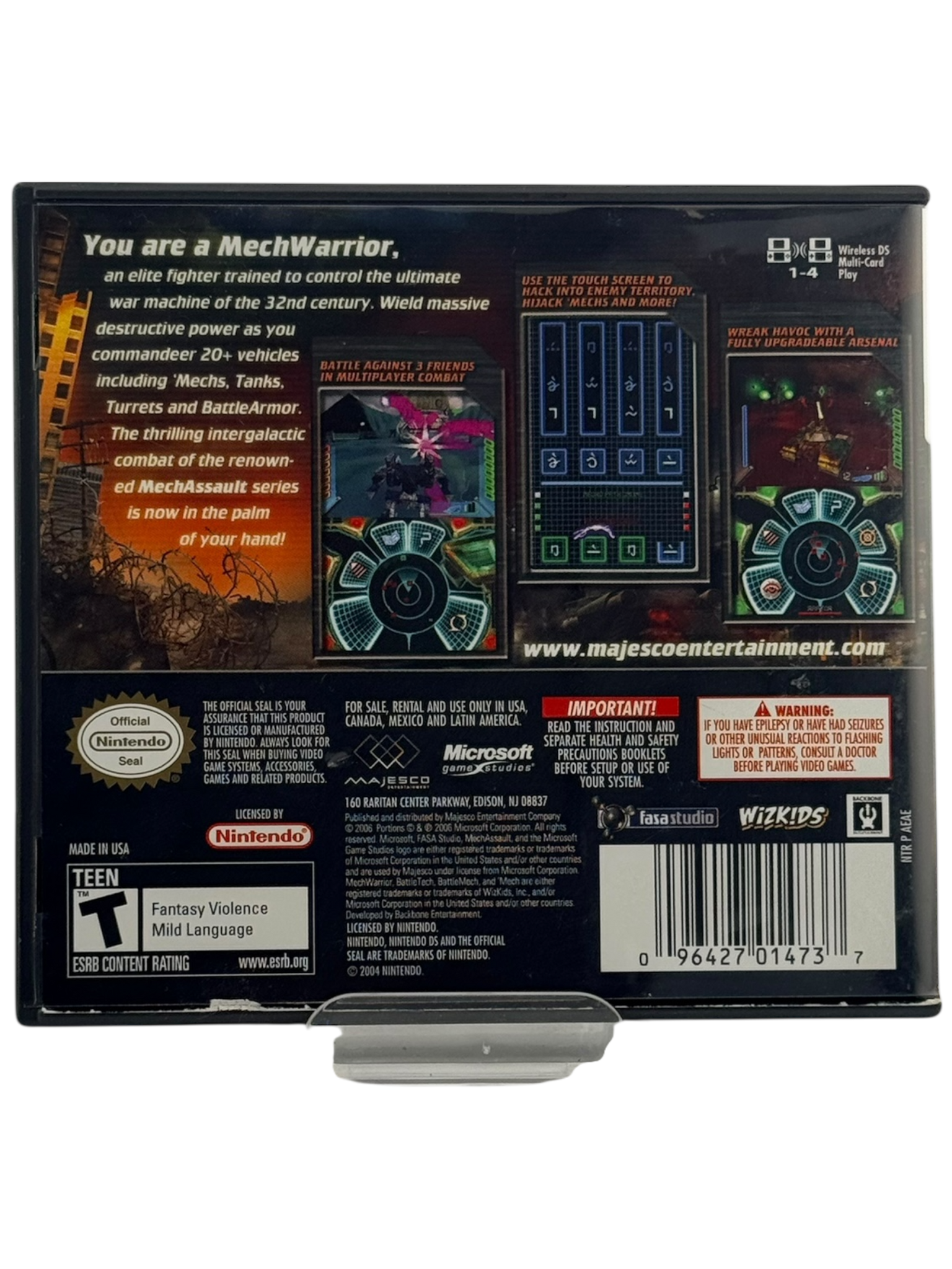 Designed specifically for the DS, the game uses the touchscreen for intuitive mech control, allowing players to aim, manage heat levels, and issue commands with precision. Featuring 20 single-player missions, destructible environments, and a variety of mechs to master, Phantom War captures the intense, strategic essence of MechAssault while adapting it perfectly to handheld play.