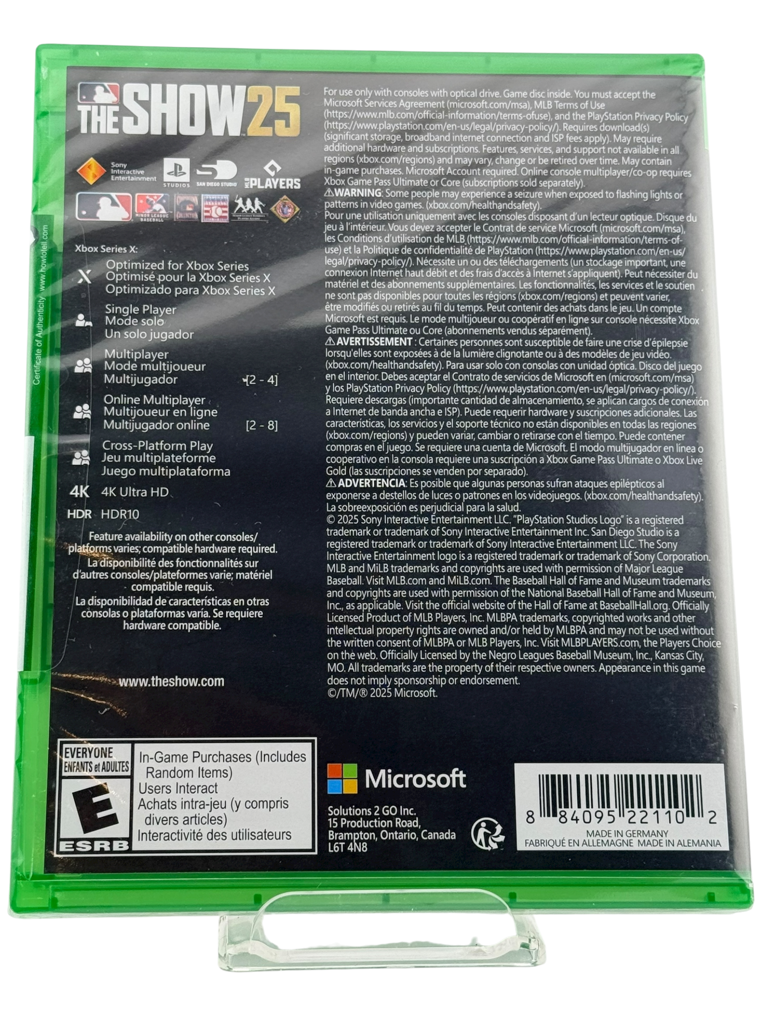This is a complete in box copy of MLB The Show 25 for the Xbox Series X. It includes the original game disc, case, and cover art insert. The disc has been tested and is fully functional. The case and artwork are in excellent condition, showing only minimal wear from gentle handling. All components are 100% authentic and sourced from official retail releases—no reproductions or bootlegs. Please review photos for specific condition details.