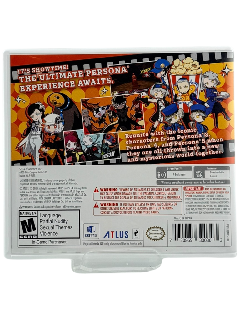This is a complete in box (CIB) copy of Persona Q2: New Cinema Labyrinth for Nintendo 3DS. The game includes the original cartridge, original case, and any originally included inserts or artwork. The cartridge has been tested and functions properly. The case and cover art show light to moderate shelf wear consistent with normal use, with no major damage unless otherwise noted. Please review the photos carefully for exact cosmetic condition and contents.