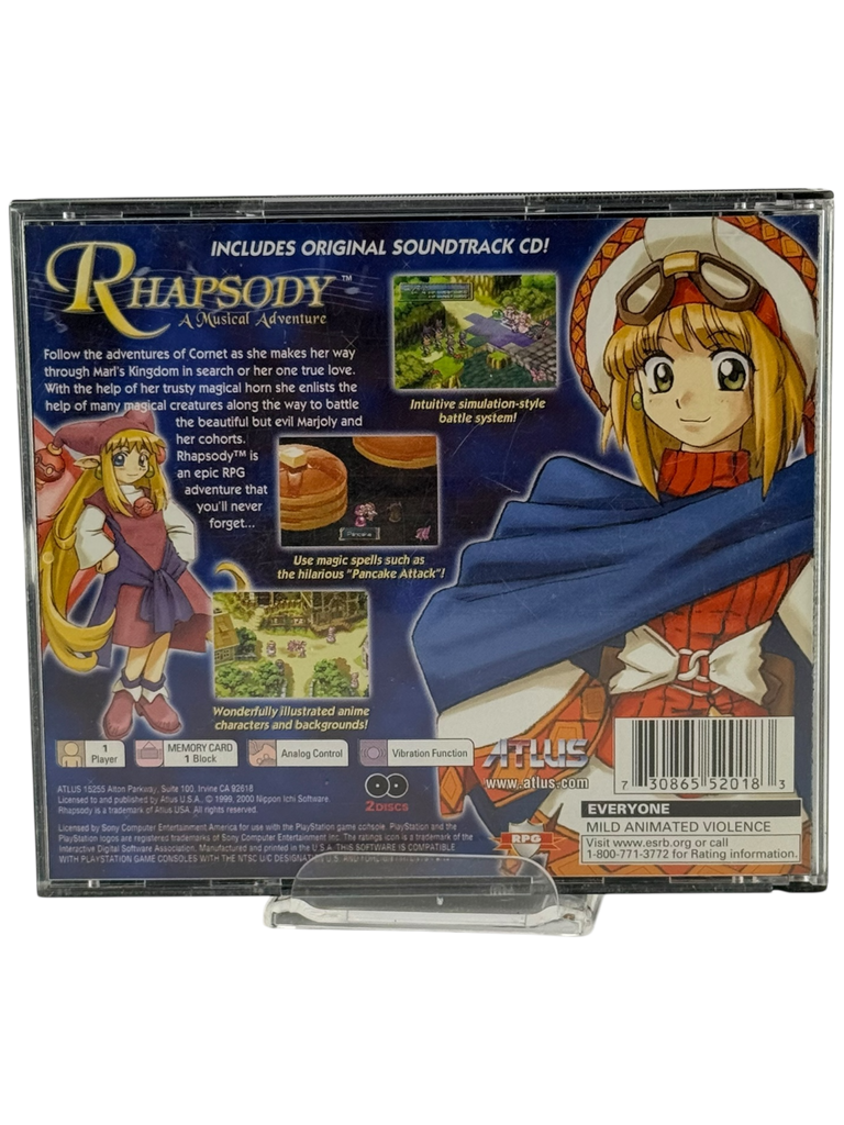 This Rhapsody: A Musical Adventure is complete in box for the Sony PlayStation 1. It includes the original game disc, manual, and case. The disc has been fully tested and verified authentic, with minimal surface wear and no read issues. The manual is complete and in excellent condition, free from tears or markings. The original jewel case and cover art are clean and intact, showing only light shelf wear consistent with age. All photos reflect the exact item you will receive.