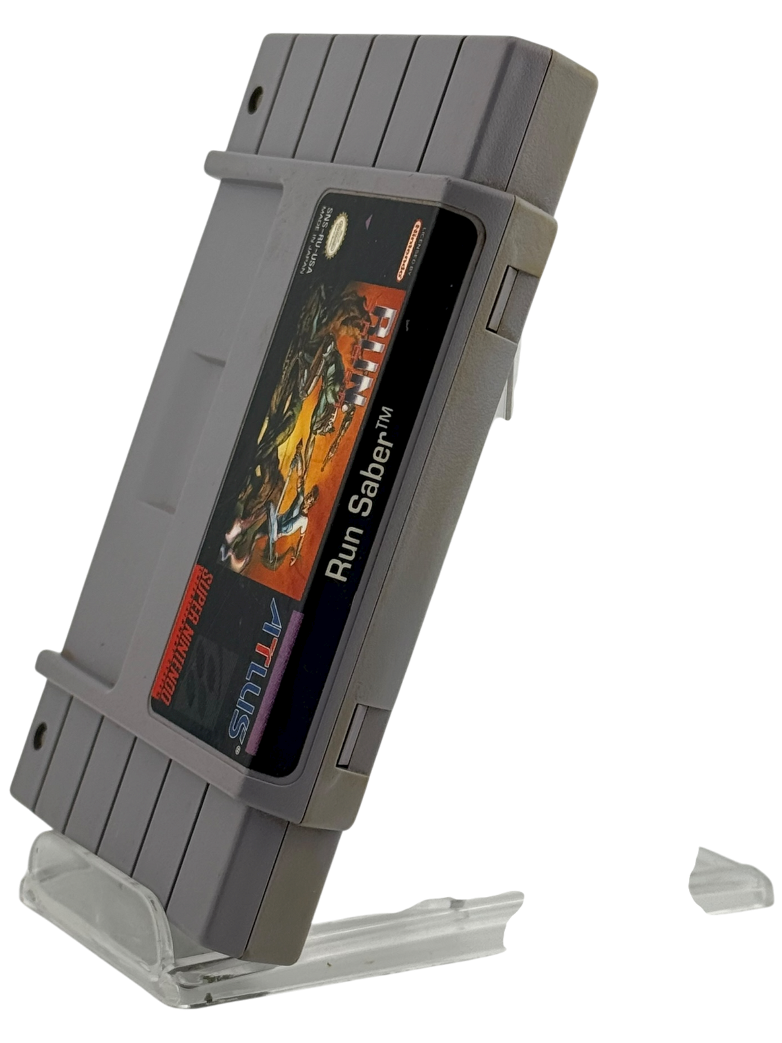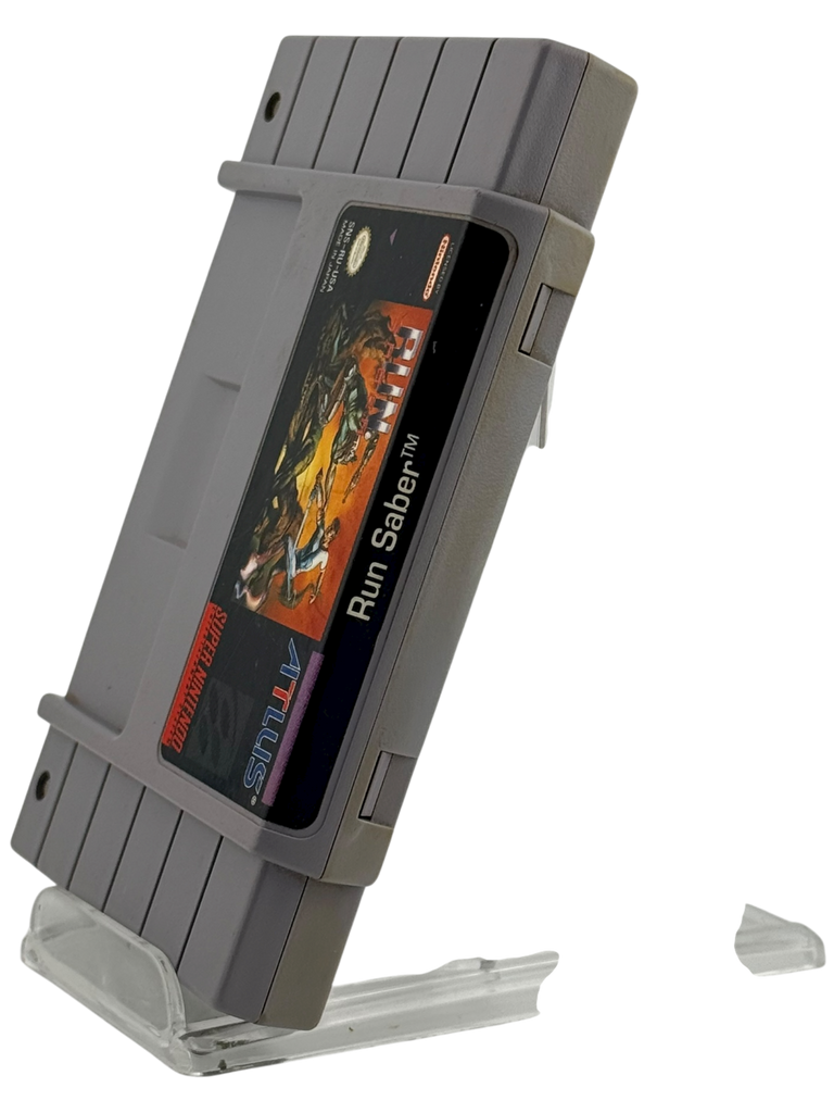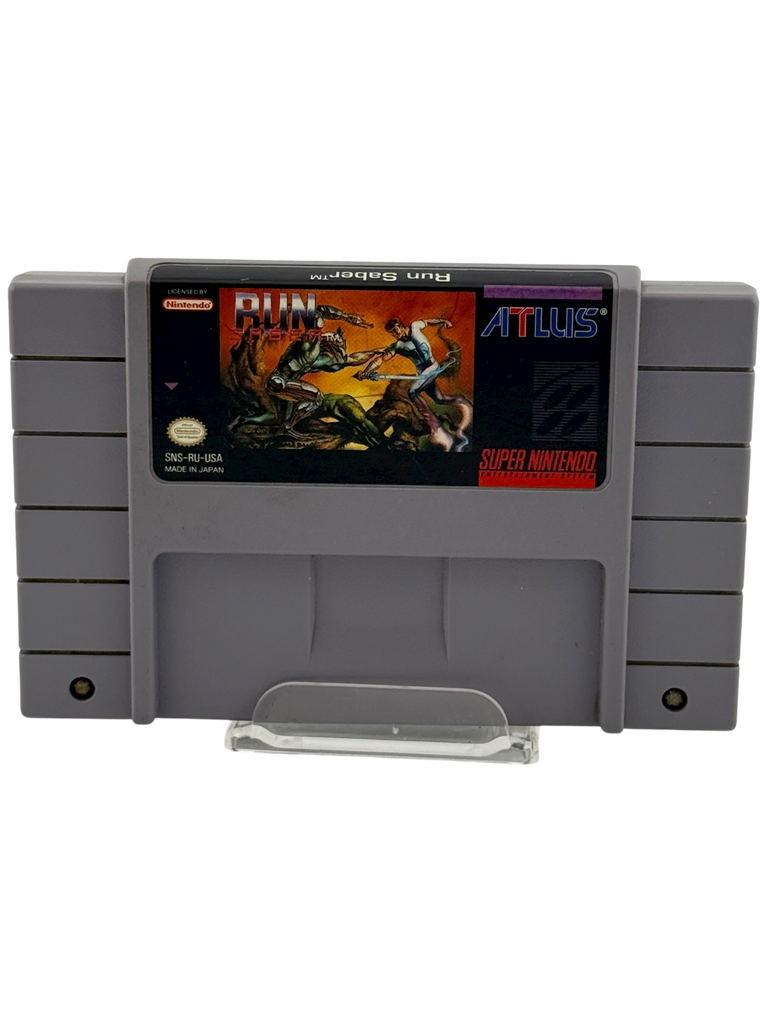 This is a loose cartridge of Run Saber for the Super Nintendo Entertainment System (SNES). The original box and manual are not included. The cartridge is authentic, fully tested, and in working condition. Some light surface wear may be present from normal handling and age, but this does not affect gameplay. Please review photos for a clear visual reference of the condition.