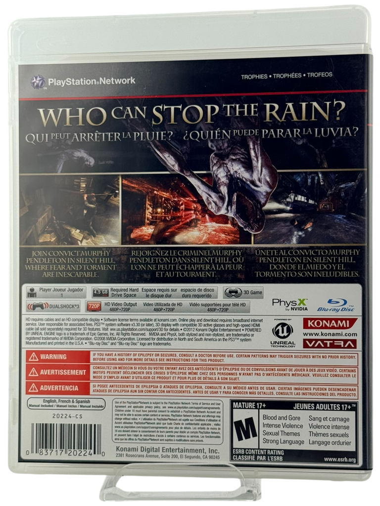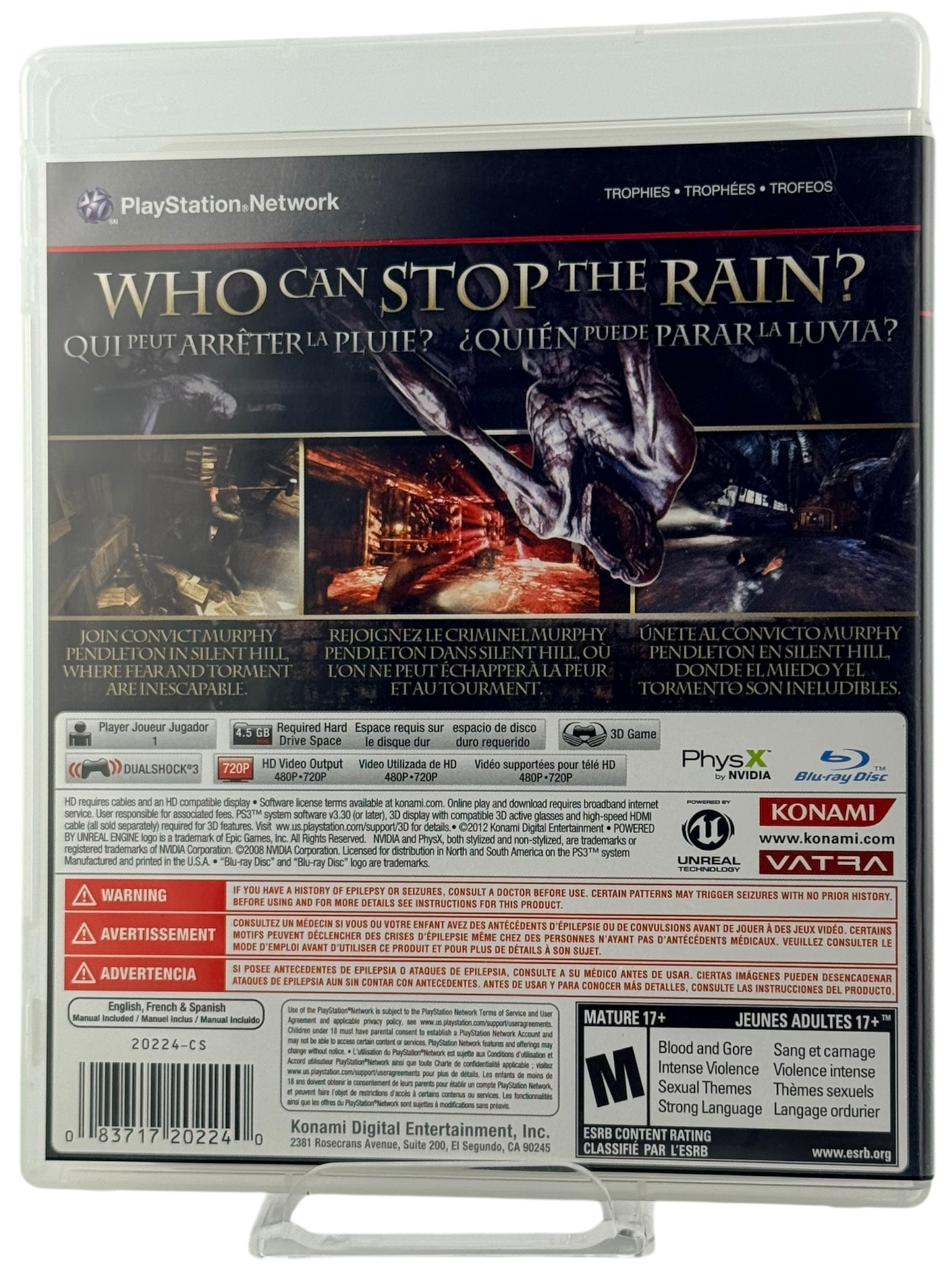 For collectors, Downpour represents one of the final major Silent Hill releases before the franchise went dormant for years, increasing its desirability among horror fans and PlayStation collectors. Its focus on mystery, moral choice, and psychological horror gives it a unique identity within the series, making it a standout piece in any Silent Hill or PS3 library.