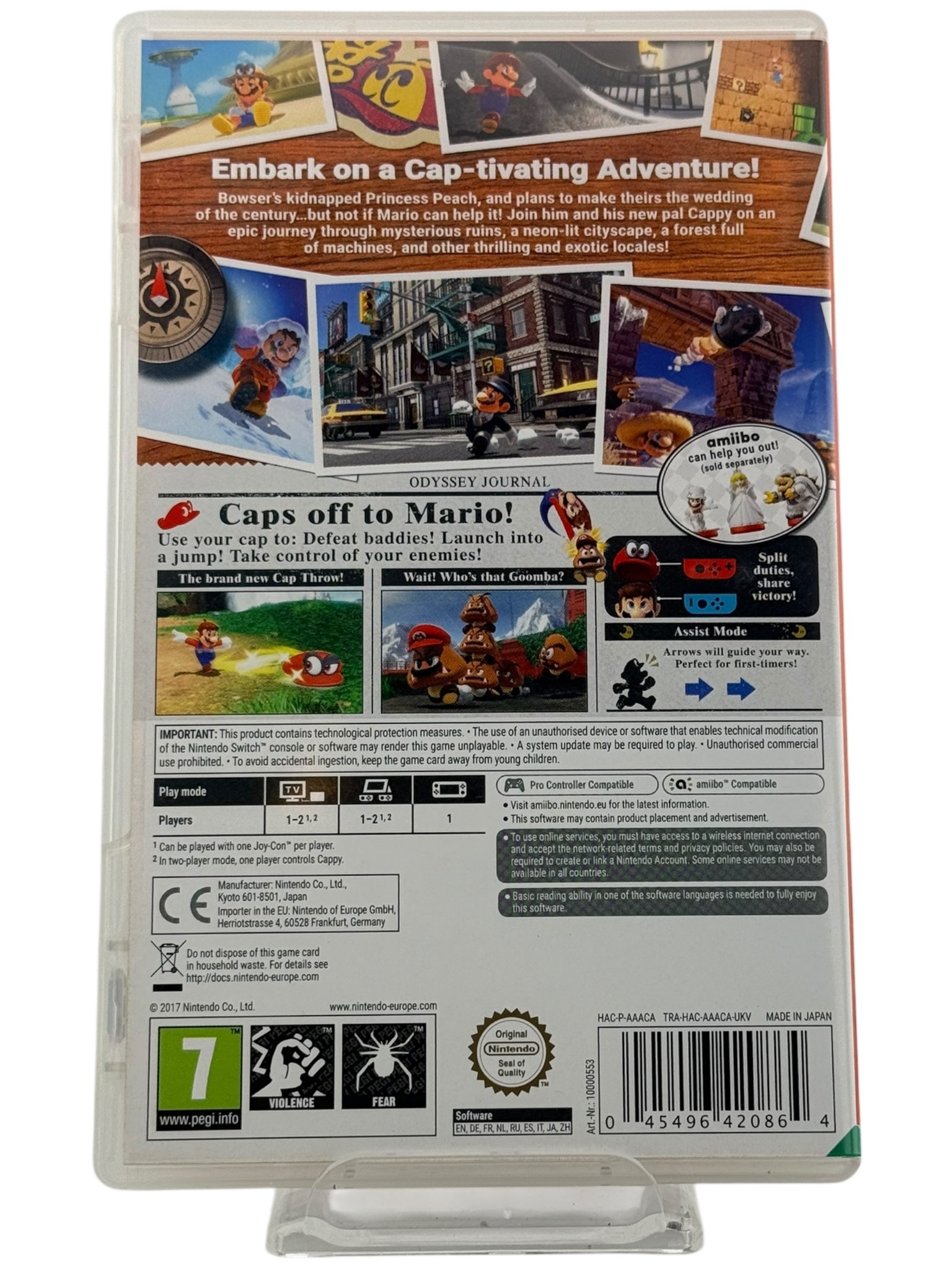 This Super Mario Odyssey [PAL] listing for Nintendo Switch is Complete in Box (CIB) and includes the original game cartridge, original Switch case with artwork, and any inserts that came with the retail release. The cartridge has been fully inspected and is in excellent working condition with no functional issues. The case and cover art are clean, bright, and show only light shelf wear. All components are authentic to the official PAL-region release. Please refer to listing photos to see the exact item you will receive.