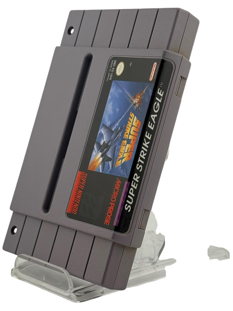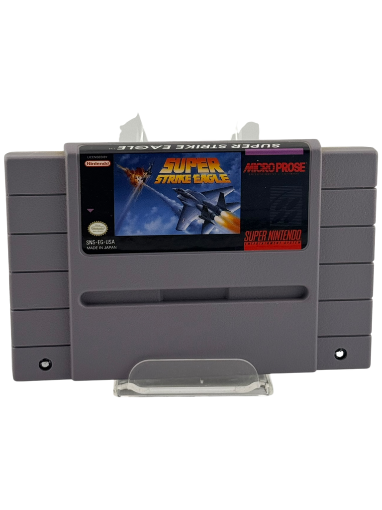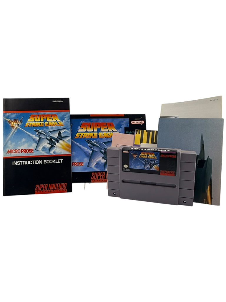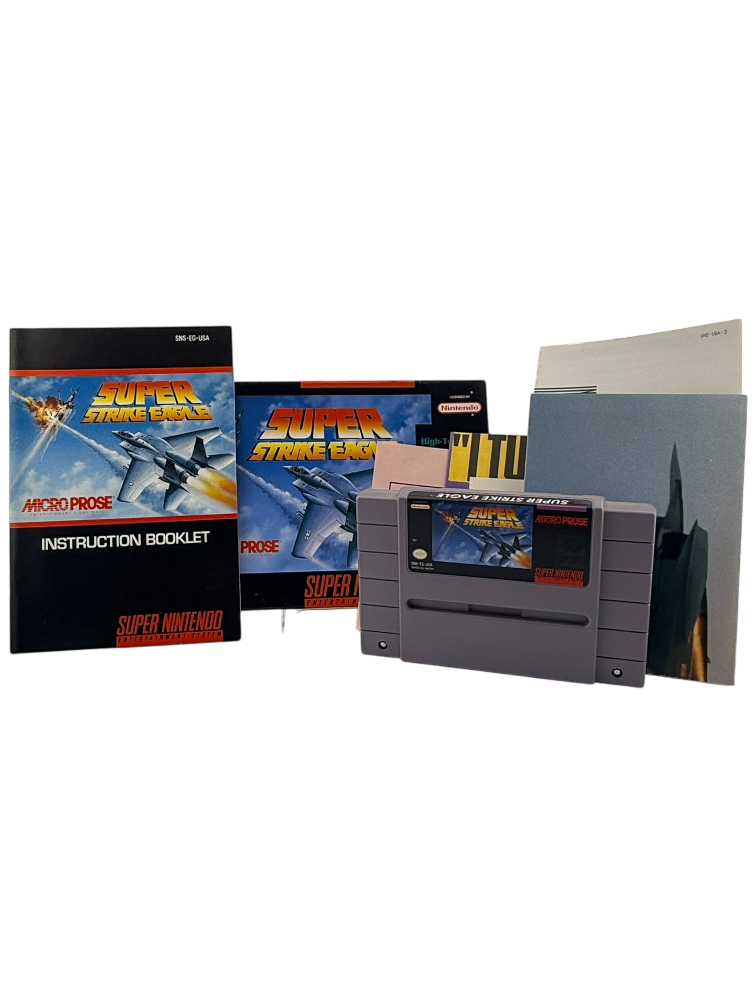 This is an authentic Super Strike Eagle game for the Super Nintendo Entertainment System (SNES). The listing includes the original game cartridge, instruction manual, and original box, all in excellent condition. The cartridge has been tested and verified to function properly, and the label is clean and intact. The box and manual show only light shelf wear from age but remain in very good collectible condition. All materials are original and official, not reproductions or reprints. Please review photos for an accurate view of condition before purchase.