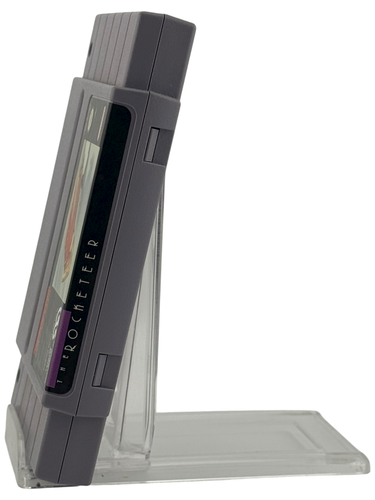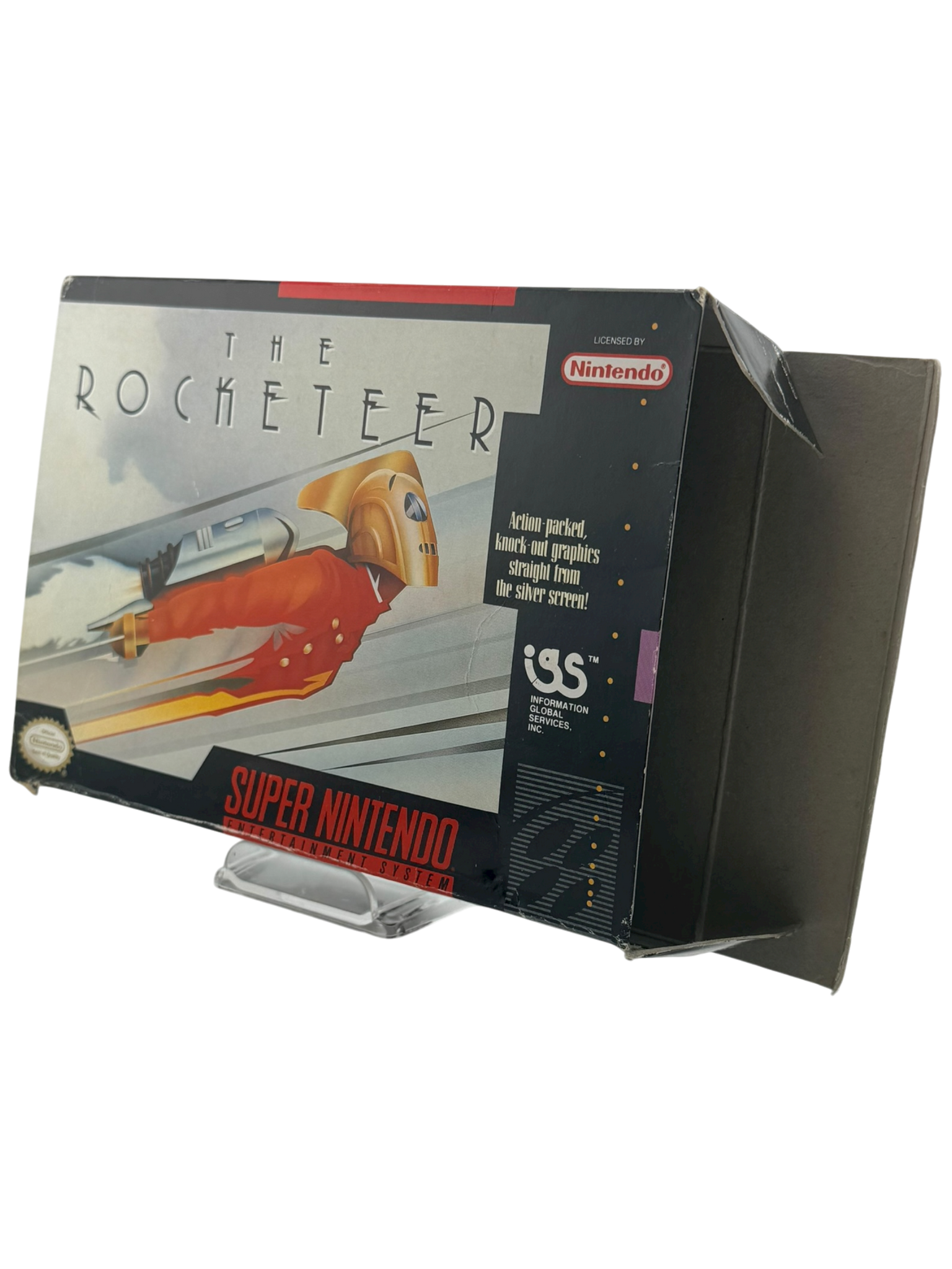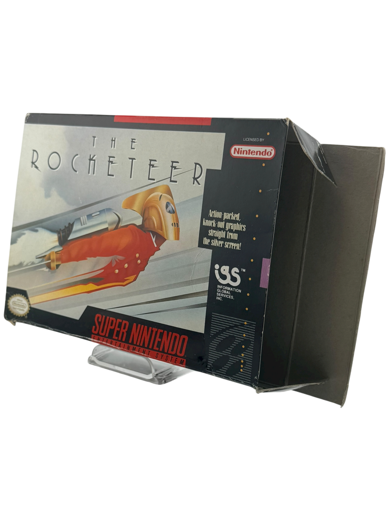This is a copy of The Rocketeer for the Super Nintendo Entertainment System (SNES) that includes the original game cartridge and box with cover art. The instruction manual is not included. The cartridge has been tested and is fully functional, showing light wear consistent with age. The box is intact and in good condition with some shelf wear appropriate for its age. Please review the photos provided for a clear view of the item’s condition.