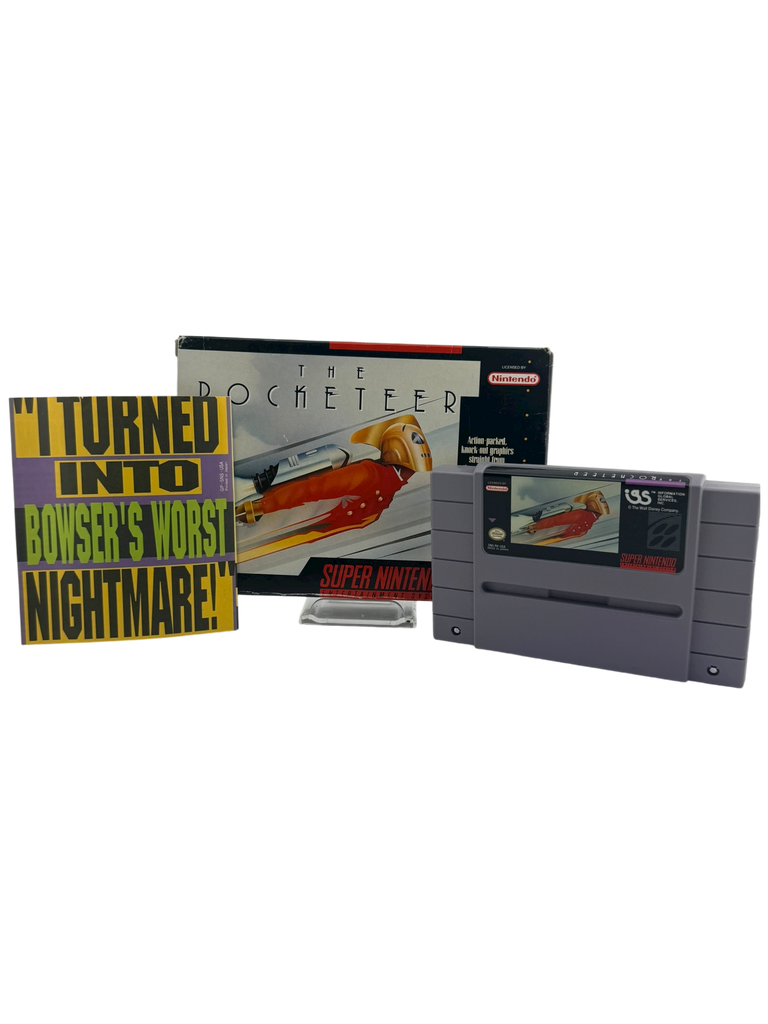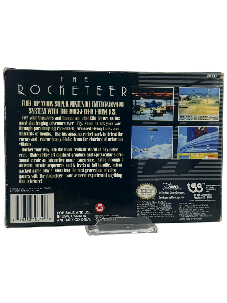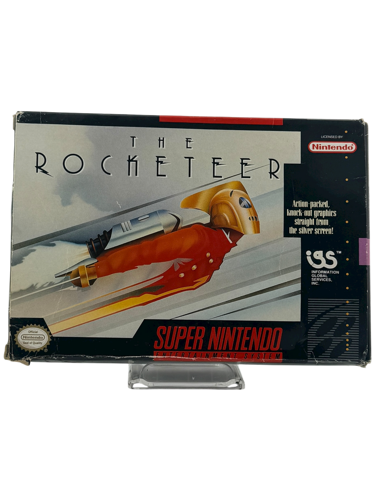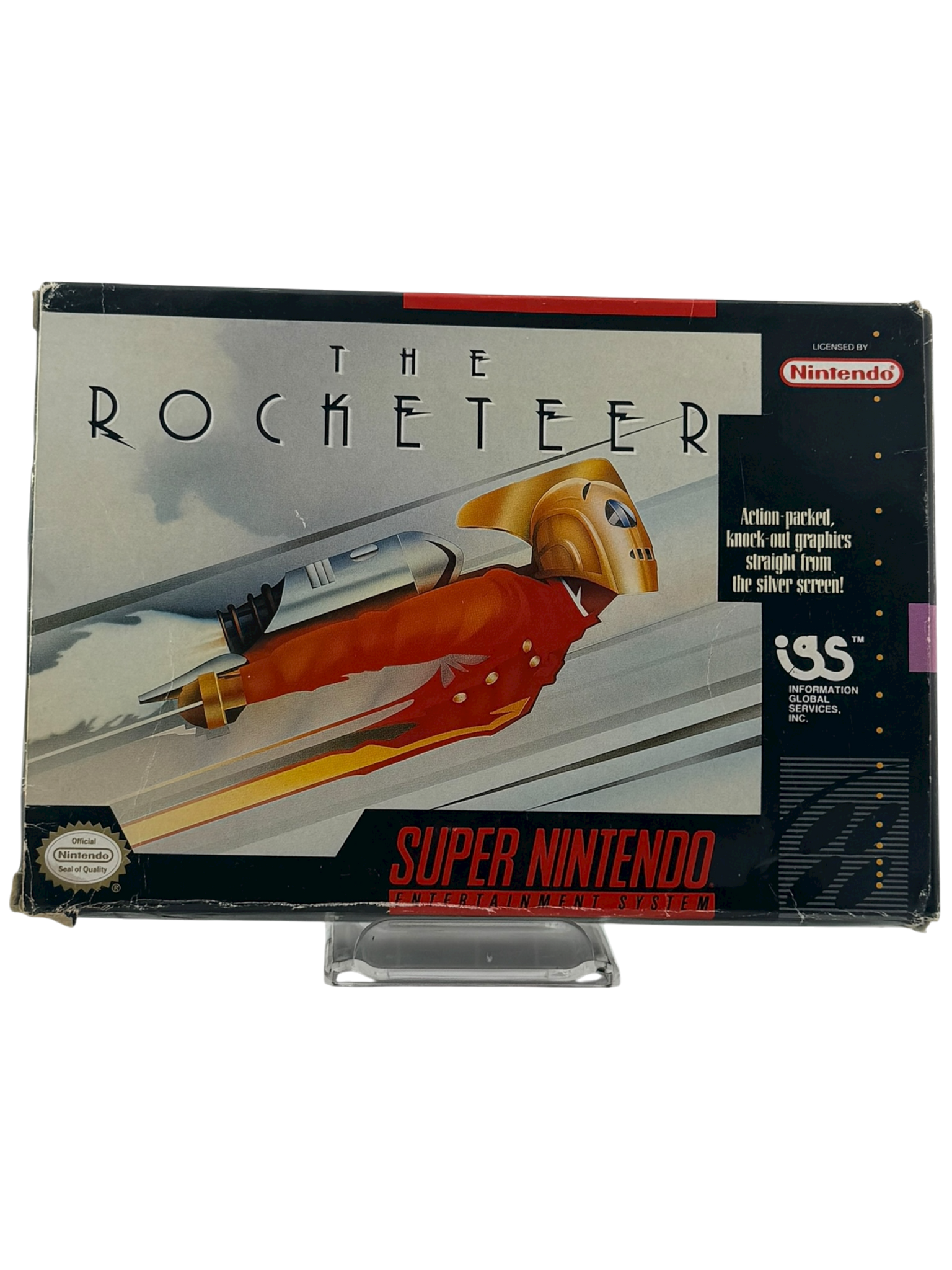 This is a copy of The Rocketeer for the Super Nintendo Entertainment System (SNES) that includes the original game cartridge and box with cover art. The instruction manual is not included. The cartridge has been tested and is fully functional, showing light wear consistent with age. The box is intact and in good condition with some shelf wear appropriate for its age. Please review the photos provided for a clear view of the item’s condition.