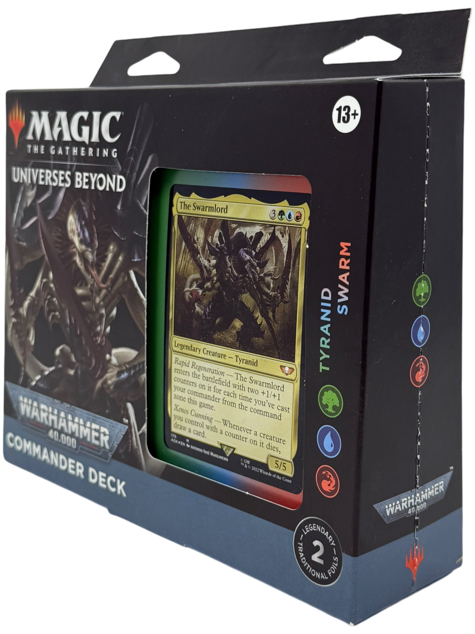 Consume everything in your path with the Tyranid Swarm Commander Deck from Universes Beyond: Warhammer 40,000! This red-green-blue (Temur) deck brings the monstrous hive mind of the Tyranids to life with massive creatures, +1/+1 counters, and overwhelming board presence. Led by the brutal The Swarmlord, this deck thrives on scaling aggression and unstoppable growth.