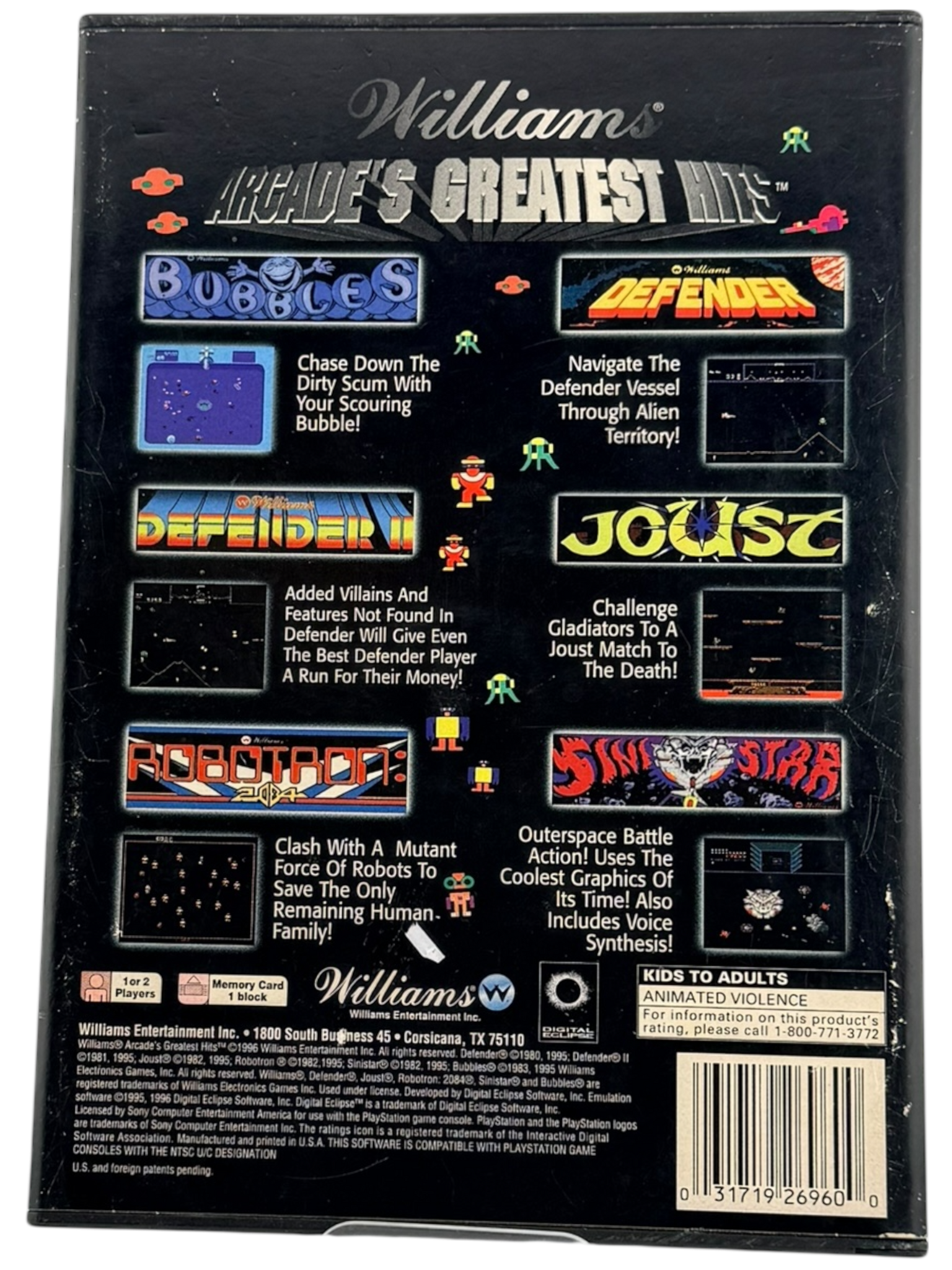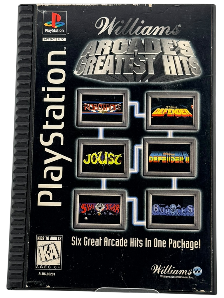 Williams Arcade’s Greatest Hits is a classic arcade compilation that brings together some of the most influential games from Williams Electronics’ golden age. This collection includes legendary titles such as Defender, Joust, Robotron: 2084, Stargate, Sinistar, and Bubbles, faithfully adapted for home play on the original PlayStation.