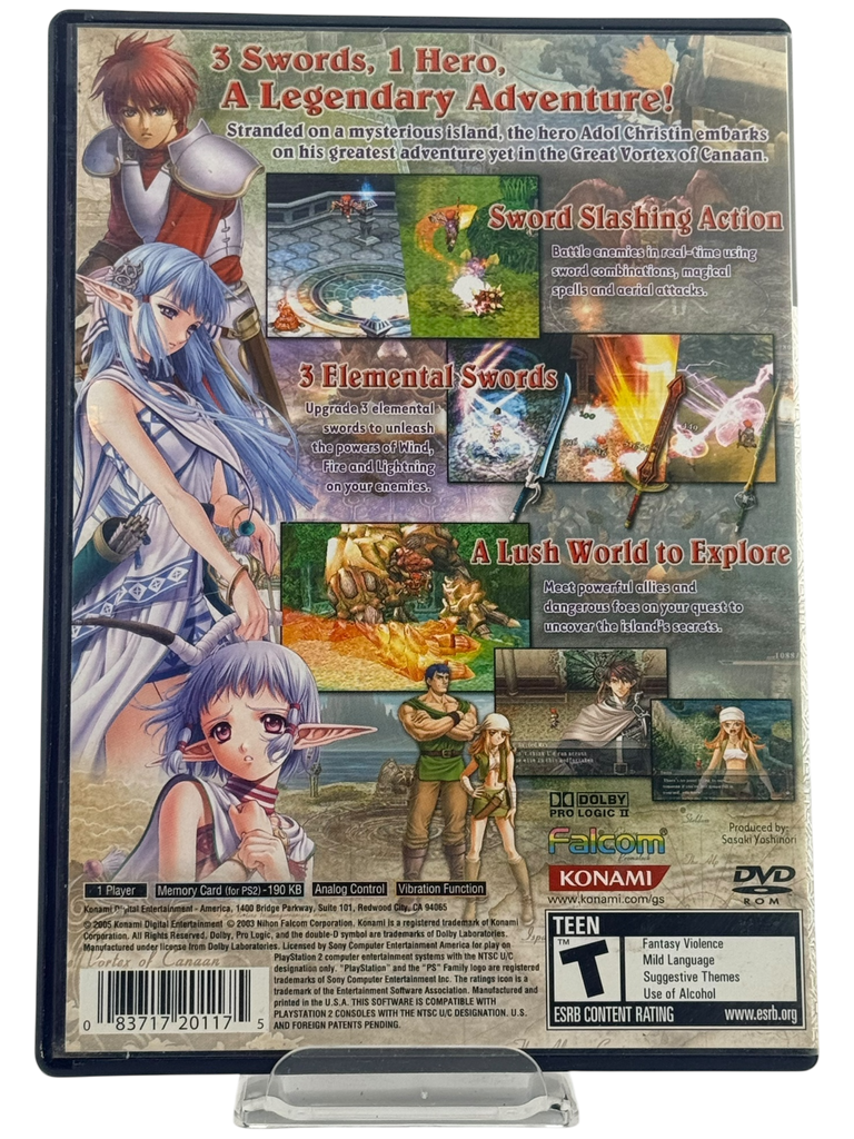 Blending fast-paced real-time combat, platforming elements, and beautifully orchestrated music, this installment offers a vibrant world filled with monsters, treasures, and secrets to uncover. The game introduces an elemental weapon system allowing Adol to switch between swords imbued with fire, wind, and lightning to exploit enemy weaknesses and solve environmental puzzles. Enhanced for the PS2 with full 3D visuals, voice acting, and animated cutscenes, Ys: The Ark of Napishtim remains a thrilling and heartfelt adventure that captures the spirit of classic Japanese action RPGs.
