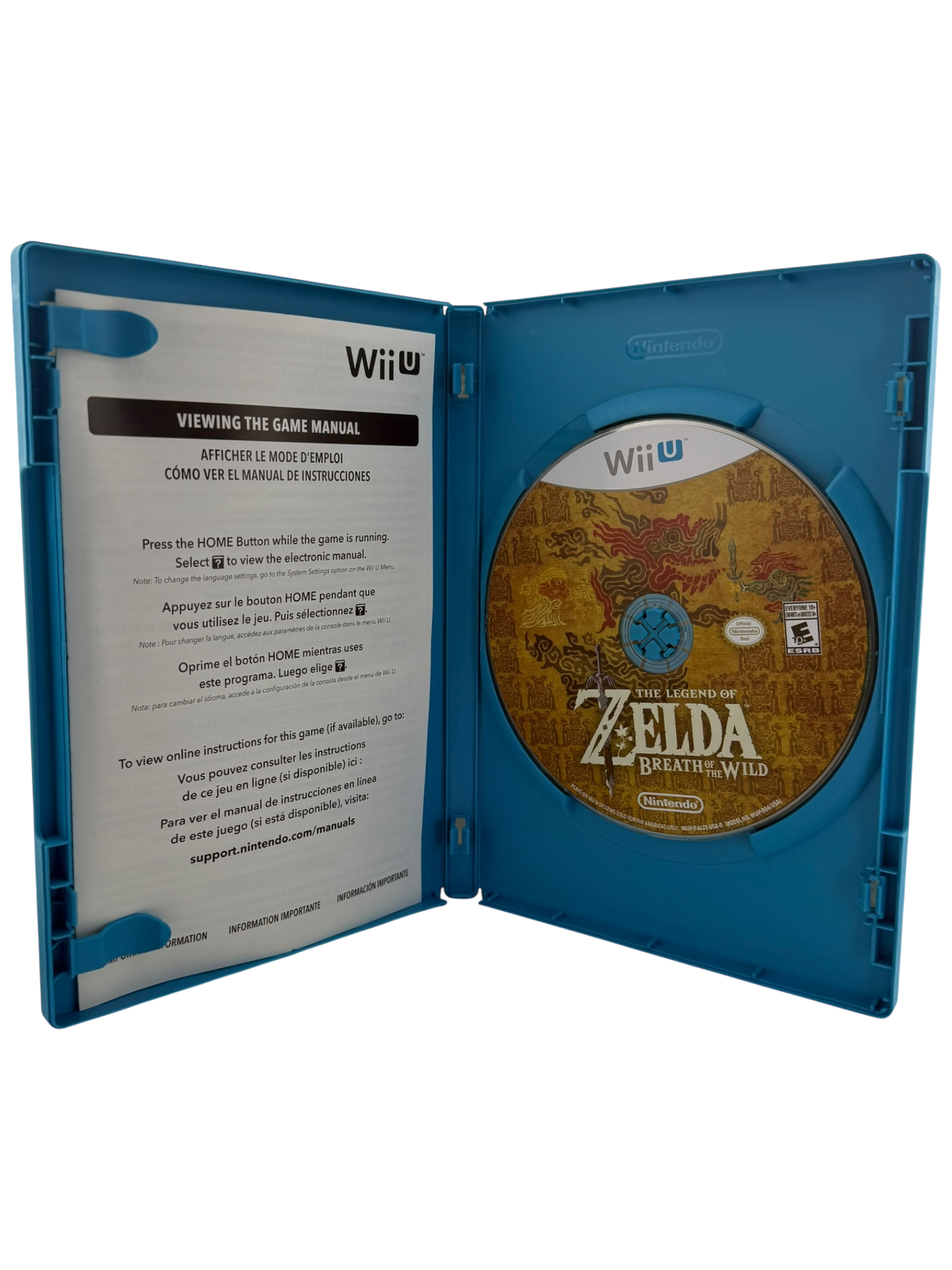This copy of The Legend of Zelda: Breath of the Wild for Nintendo Wii U is complete in box, including the original game disc, manual/inserts, and case. The disc has been tested and is fully functional, with only light surface wear from prior handling. The case and inserts are in good condition, showing minimal shelf wear. Photos are provided to verify authenticity and exact condition.