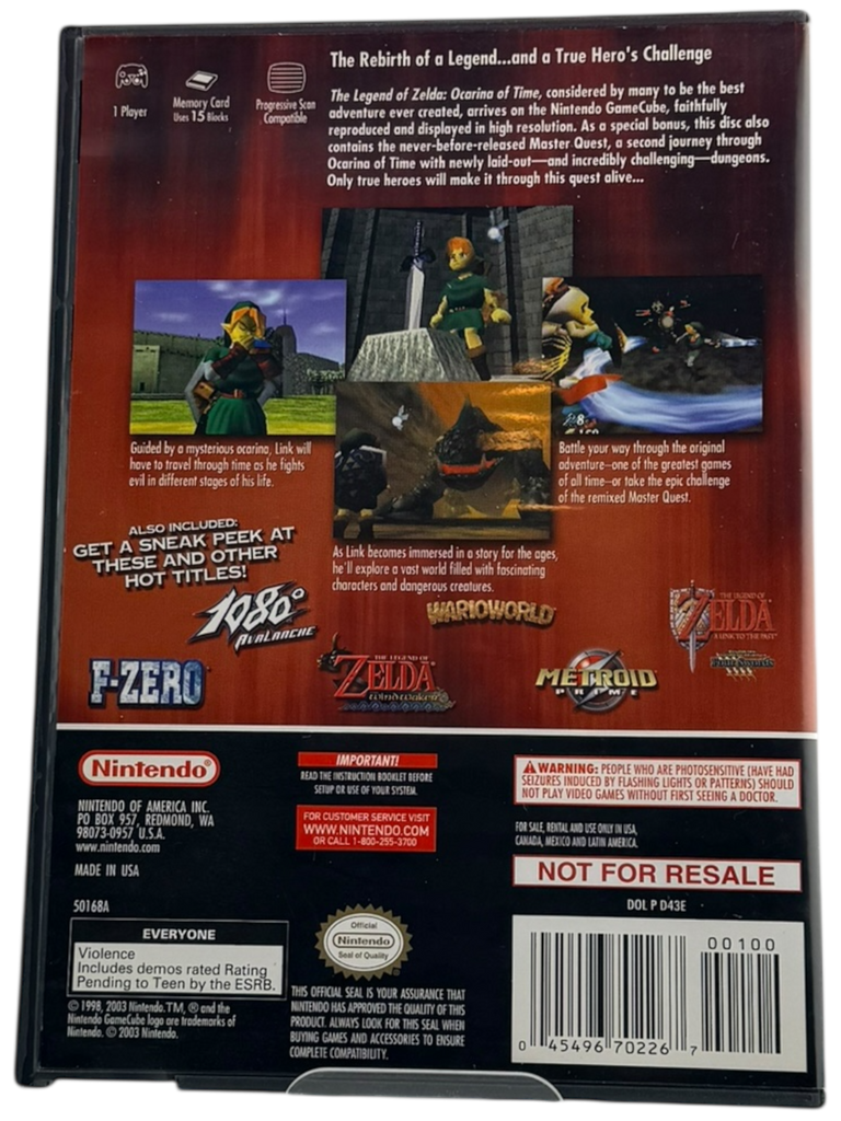 This is a complete-in-box (CIB) copy of The Legend of Zelda: Ocarina of Time – Master Quest for Nintendo GameCube. The original game disc, manual, and case are all included. The disc has been inspected and is in good working condition. The case and cover art are original and show light signs of normal shelf wear consistent with age. The manual is included and intact. Please review the photos carefully for exact cosmetic condition, as they are part of the description.